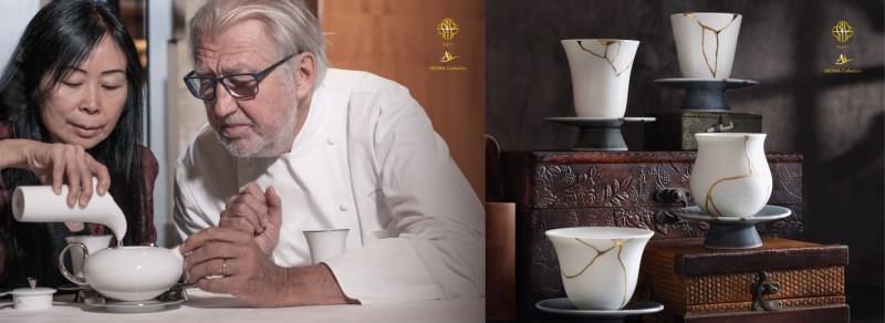 左图:茶艺大师曾毓慧向米其林三星主厨Pierre Gagnaire展示香氲系列 “银狐(Silver Fox)” 专利茶壶,壶身带有冷热水位标记