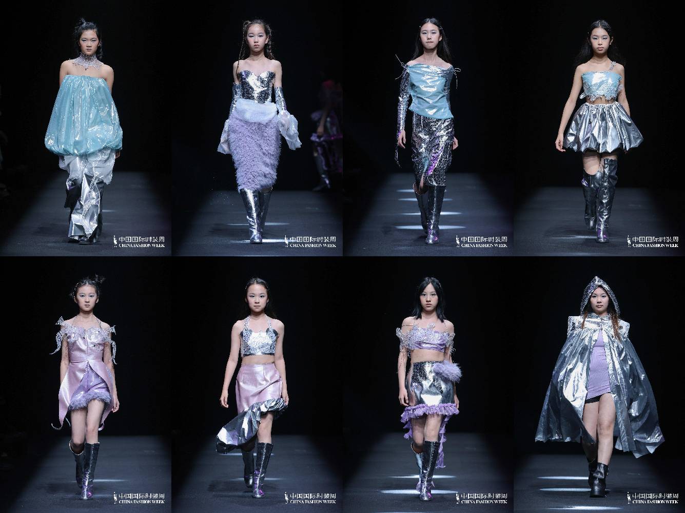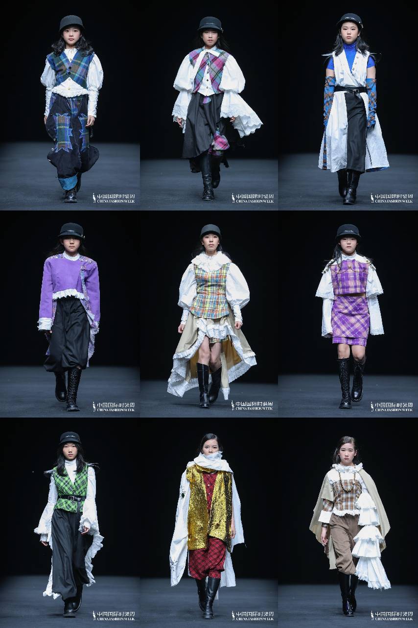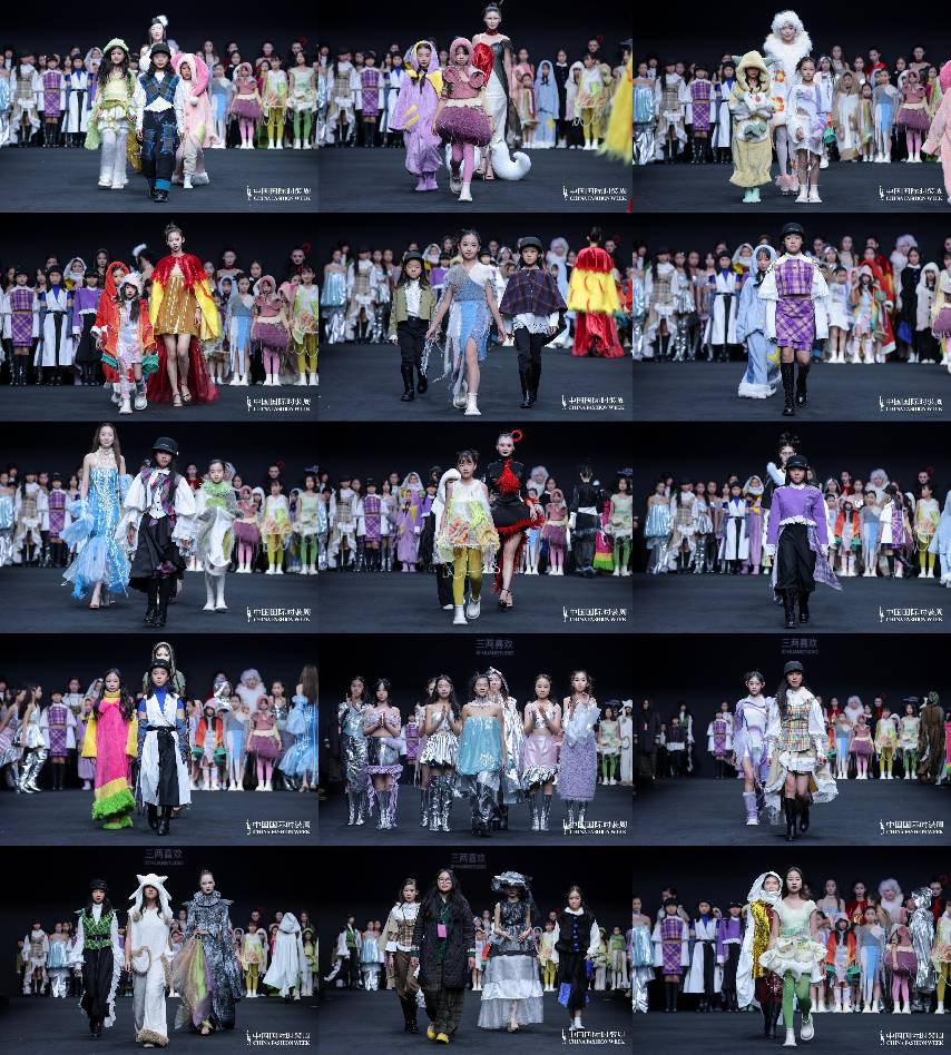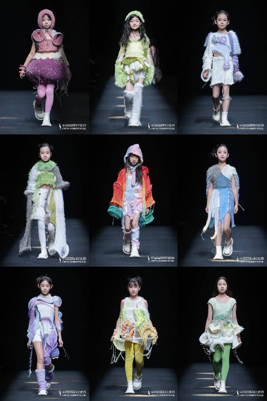 秀场上,小设计师们也是模特,身着自己设计的成衣,以破茧成蝶的姿态从幕后走向台前。她们站在聚光灯下,不仅是在展示服装,更是在宣示—种独属于她们自我精神世界的“童年美学”。这种天然而有力的儿童视角,构成了对成人时尚体系的—次生动解构,为中国时尚界注入了—股最纯粹、最具生命力的原创力量。而在聚光灯照不到的秀场外,她们是—群心怀梦想的小朋友,用针线编织着自己的未来。她们怀揣对时尚的热爱。追梦之路并非坦途,这群小设计师常常要面对来自外界的种种质疑,有人怀疑她们是否真正参与了设计制作,有人追问参与的深度与分量;也有人对她们的作品提出审美上的评 判,褒贬不—。与此同时,内心的自我怀疑也在悄然滋长,因缝纫的线无法达到要求而拆到委屈流泪,因想法无法完全呈现实物而焦急不已,这些是在工作室里反复上演的场景,也正是她们成长的真实注脚。