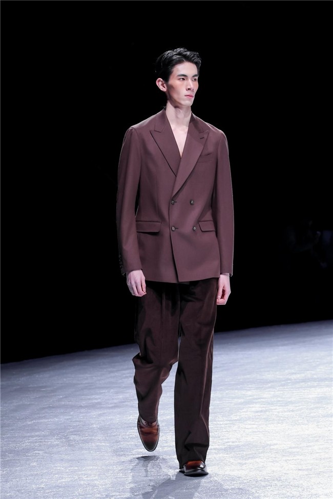当模特从深处走来,人们看到的是一种回归——回归到服装最本质的表达。这一系列重新定义了当代男性的通勤装,将职场所需的得体与流动的时尚趋势悄然缝合。羊毛的温润与科技面料的挺括在同一件衣物上相遇,经典剪裁被赋予新的生命:肩线利落却不僵硬,廓形简洁却有筋骨。没有冗余的装饰,没有浮夸的张扬,只有经得起时间审视的品质。它们是献给那些相信长期主义的人——一件衣服的价值,不在于一季的流行,而在于五年后、十年后,你依然愿意穿上它,走进任何一场重要会议。
