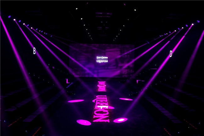 配合现场背景板上“LEAF CROWN × ULEEFON”的投影标识,以及模特面具上的粉色生物纤维装饰,粉色字母装置在黑色秀场中形成一条充满生命力的视觉动线——黑色是生命积累的厚度,粉色是破茧而出的光芒,二者递进呼应,既清晰构建出“从蛰伏到新生”的叙事线,又将“走向重生”的生命哲学与“绿色可持续”的品牌主张直观呈现在观众眼前,实现了时尚美学与环保理念的完美共生。
