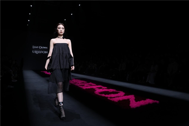 情景剧式开篇过后,正式进入黑色系服装展示环节。35位模特依次登台,身着Leaf Crown专为本次合作打造的黑色系列单品,将“沉淀与勇气”的寓意具象化。