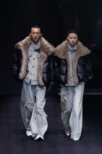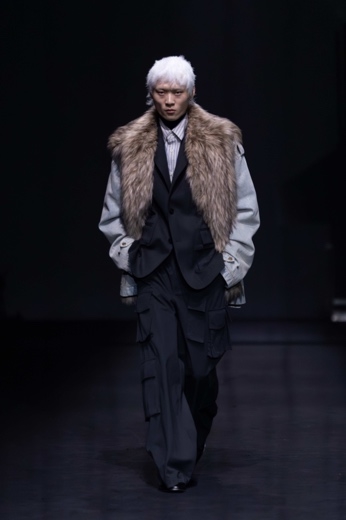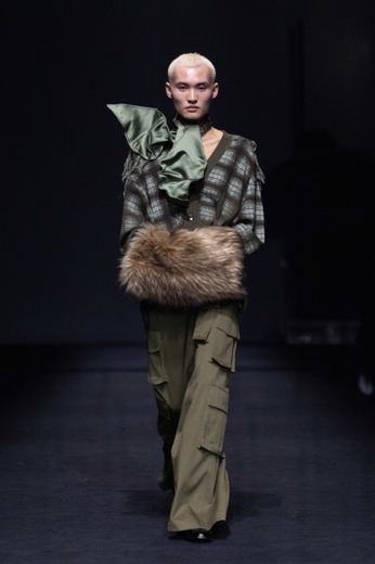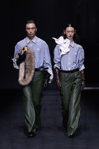 男女装共享相同的结构语言与工艺技法。秀场造型紧密贴合“两仪”理念——模特成对出现,身着镜像般的服装,有力强化了 Feng Chen Wang 一以贯之的无性别设计根基。