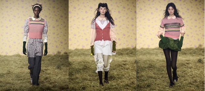 动物元素成为本季的重要叙事符号。在手工提花针织与费尔岛图案之中,它们不再只是图案,而是转化为一种源自乡野的本能力量。铆钉马海毛费尔岛在柔软肌理中嵌入金属细节,呈现温柔与力量的平衡。牦牛绒复古提花以细密组织转译乡村图腾,绞花纹理点缀亮粉色绣花,在厚重纹理中注入轻盈层次。薄透组织手工钩花与厚实羊毛对比呈现,形成“轻与重”的结构平衡。金属丝钉珠手工花、皮革绣花、油蜡皮拼接碎花与针织结构交错运用,使传统田园元素在现代语境中重新生长。面料体系围绕羊毛羊绒、马海毛、格纹毛呢、皮革、牛仔展开,在天然纤维的温度中保留手工痕迹。叠层与拼接工艺赋予面料时间沉淀般的层次,使植物与动物图腾不再停留于装饰,而成为贯穿系列的视觉语言。色彩来自土地、牧场与冬日天空的自然变化,以深褐、橄榄绿、铅白、靛蓝为主调,辅以砖红、天蓝、肉粉点缀,在沉静基调中注入温度与生命力。
