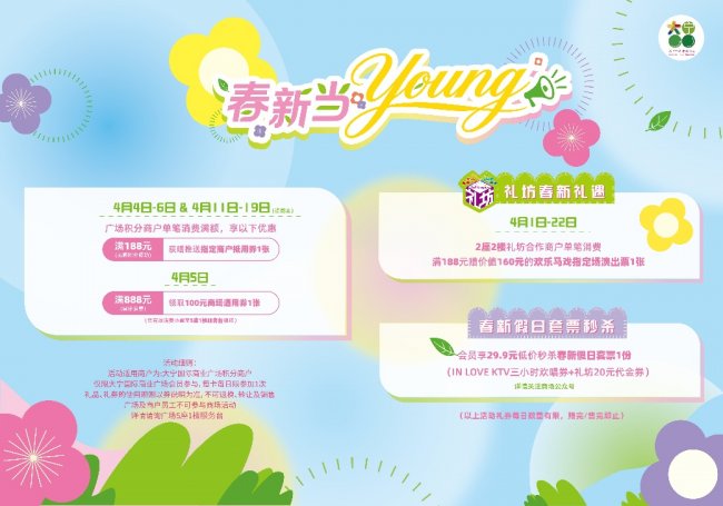 恰逢时节焕新,专属宠粉福利上线,吃喝玩乐全优惠,手慢无赶紧码住。4月4-6日&4月11-19日逢周末,广场积分商户单笔消费满188元(无感积分成功)获赠推送指定商户抵用券1张;4月5日,广场积分商户累计消费满888元可领取100元商场通用券1张(凭有效消费小票至5座1楼服务台领取);即日起-4月22日,2座2楼礼坊合作商户单笔消费满188元,赠价值160元的欢乐马戏指定场演出票1张(以上活动礼券每日数量有限,赠完/售完即止)