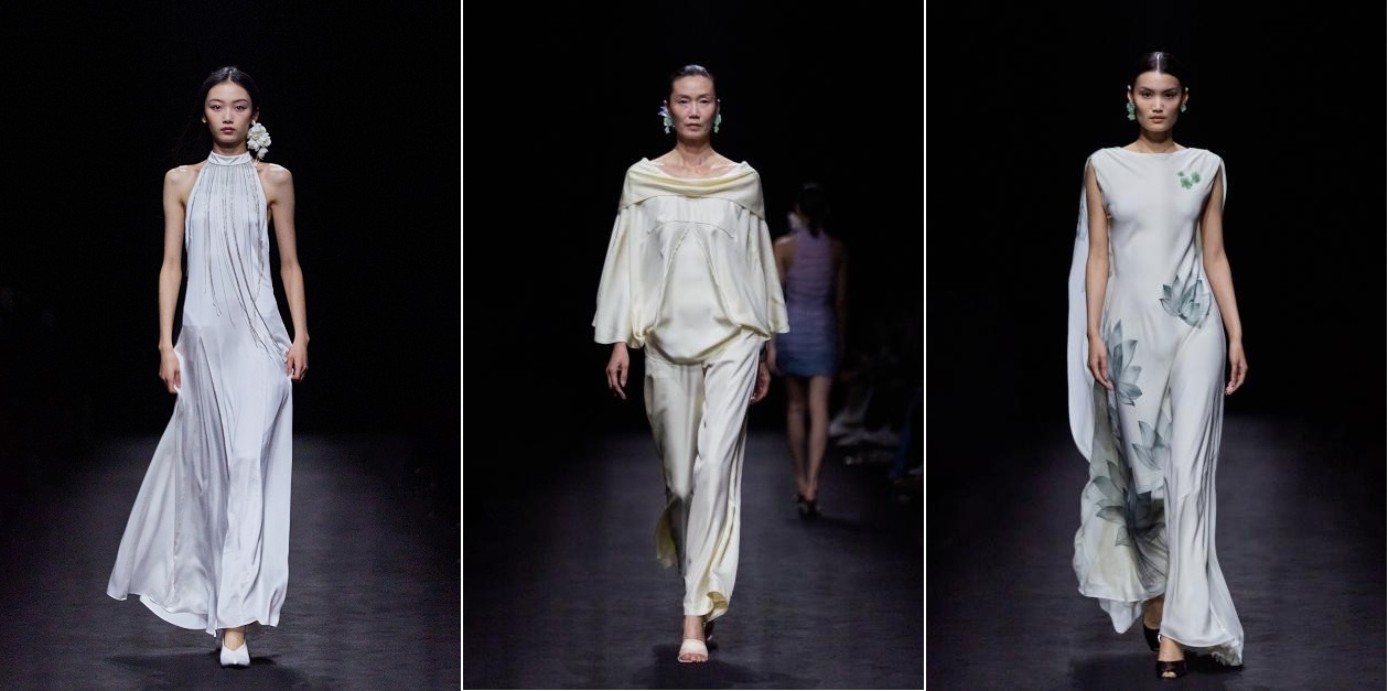 品牌以东方宇宙哲学为基底,坚守匠心工艺,为本系列构筑出形而上的时装体系。在设计表达中,真丝成为核心材质,品牌打破其单一使用形式,从轻盈通透的欧根纱,到兼具挺括质感的丝羊毛剪裁,挖掘真丝的多元表达维度;同时以当代廓形重释中国古代竹编技法,将莲花意象与莹润玉石质感融入设计,让每件衣物都成为承载光与东方气韵的独特载体,实现哲学思考与时装设计的深度对话。