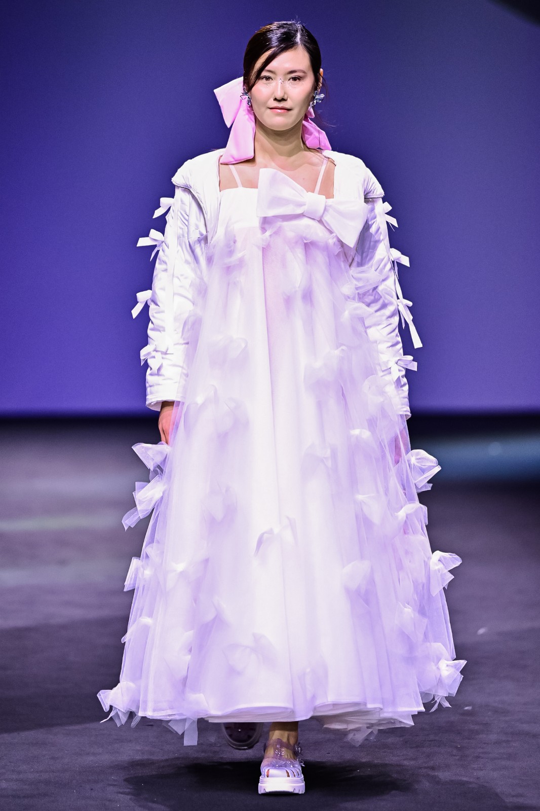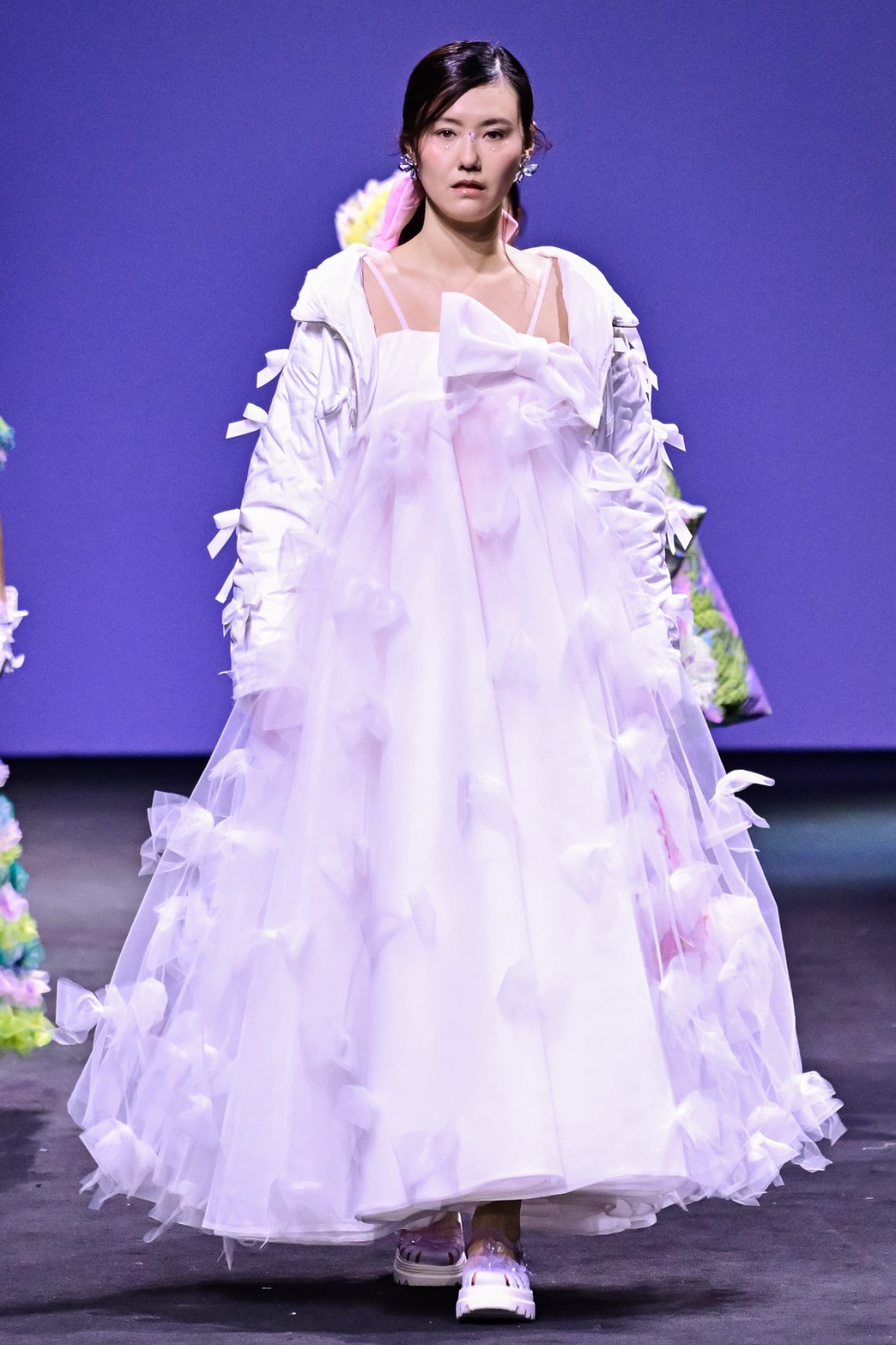 系列以丰富的包裹与蝴蝶结细节为核心,同时借助透明感、花卉几何与色彩解放光的流动,在服装内部营造出发光的幻觉。包裹、蝴蝶结与流动的丝带肩带构建出刻意的矛盾:克制与释放共存,柔软与叛逆并肩。造型携带着勇士的力量与反叛精神:征服自己的灵魂,花朵将在无限中再度盛开。