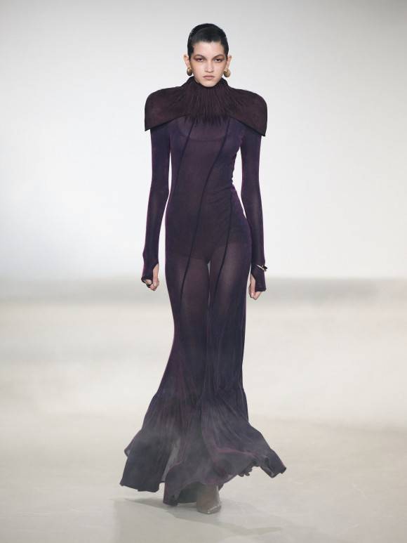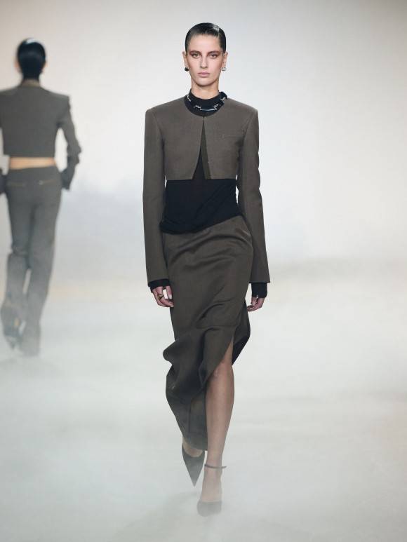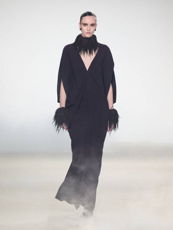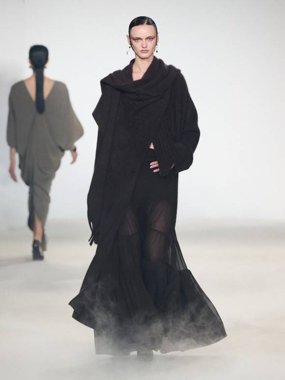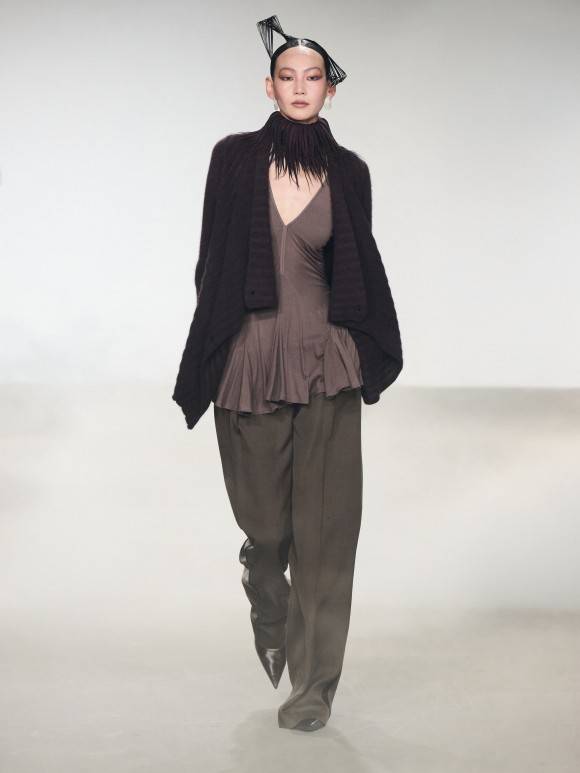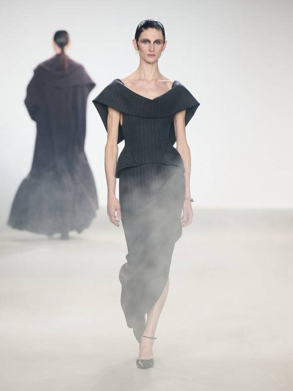 灰色系列来自品牌经典延续的重磅乔其缎面材质,两块面料被精巧的悬垂于肩部,前后片在肩部缝合,自然形成V领与悬垂的巨型袖窿。真丝乔其纱与乔其缎相拼合,几何的线条在躯体间切割出丰富而精准的轮廓与质感。男装元素被再次演绎,精裁套装通过折叠的领部结构形成别致的层次造型;立体裁剪披肩胸衣与直筒半裙由精纺羊毛条纹材质制作,塑造出利落而充满力量的女性画像。
