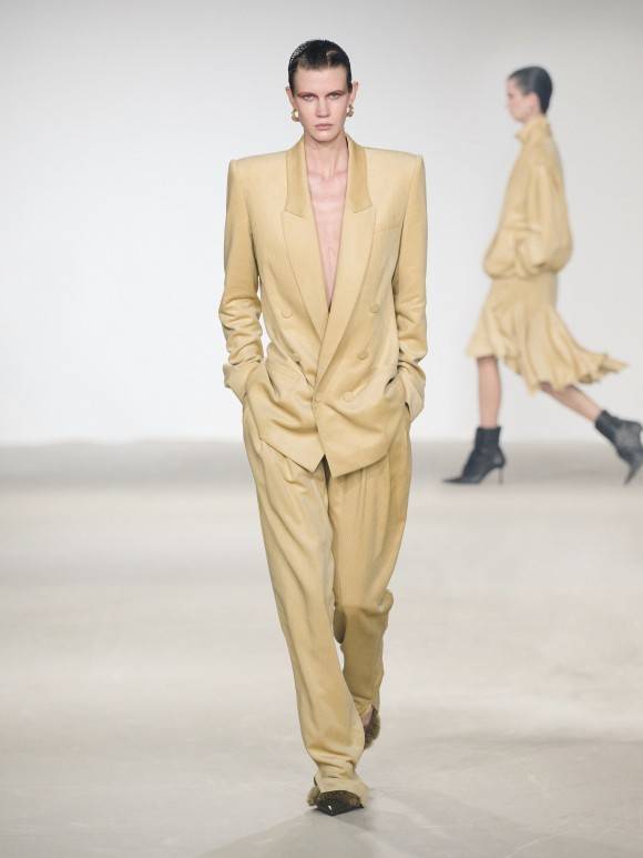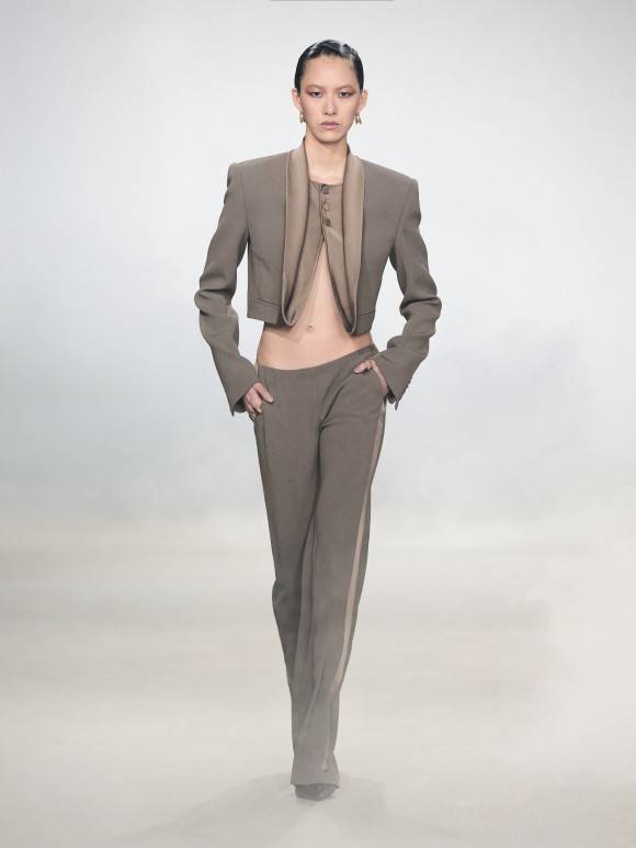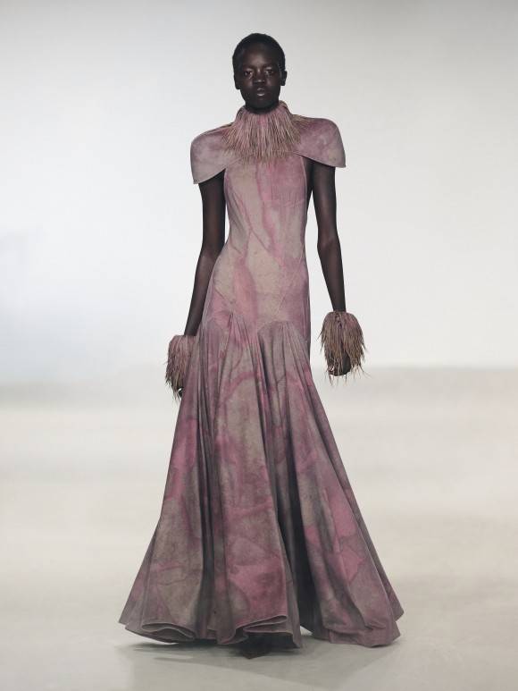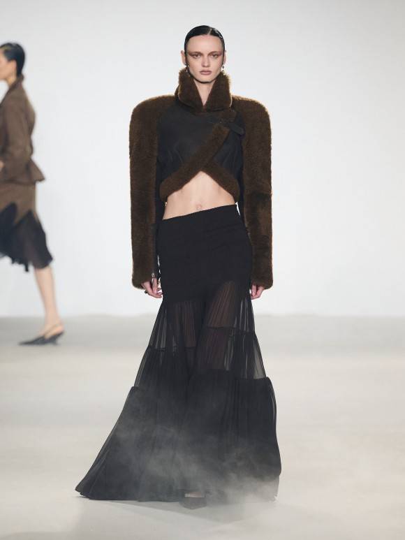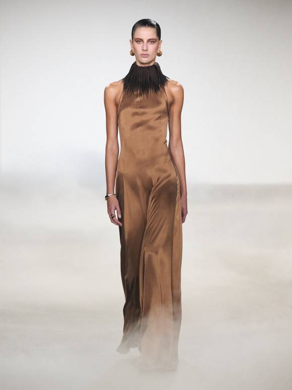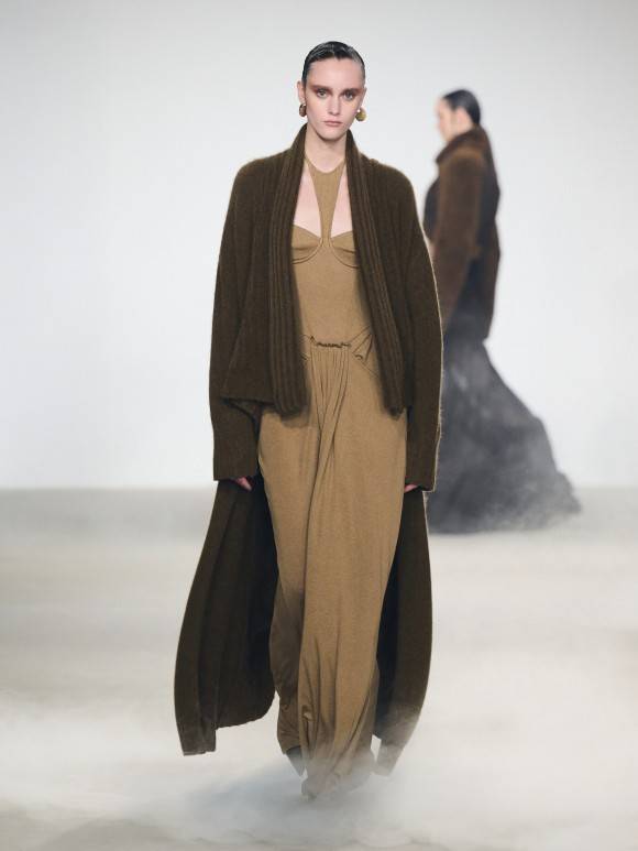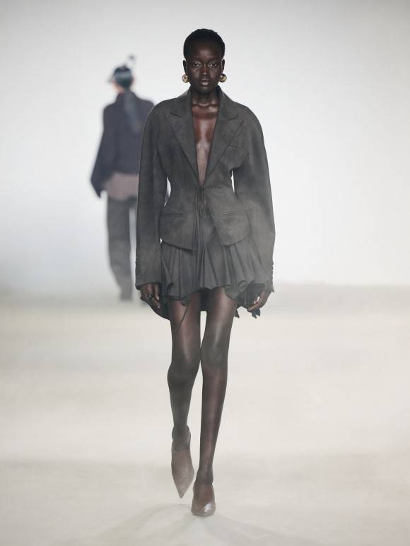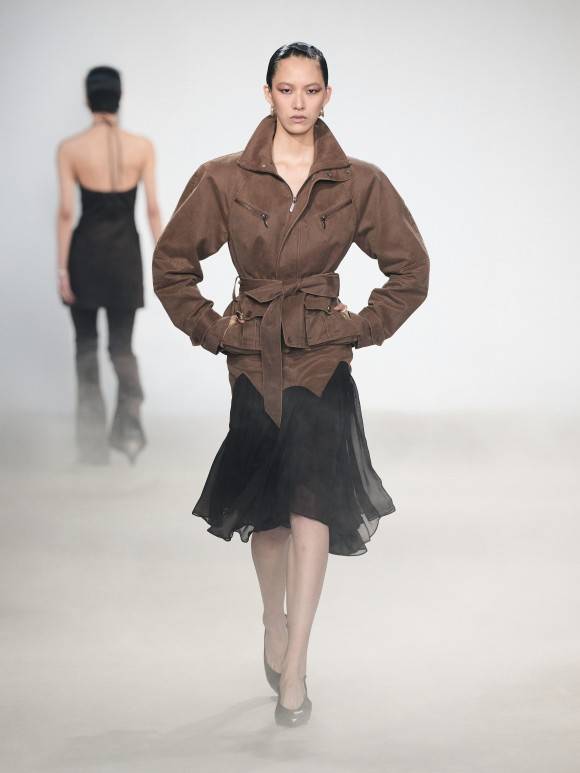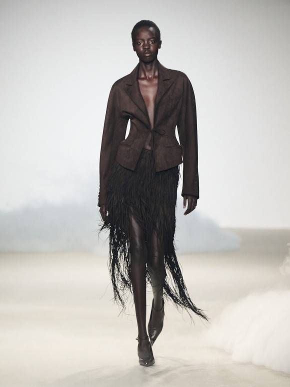 一段悠长低沉的音乐拉开秀场序幕,一系列大地母体般的棕色系列印入眼帘:尖锐而带有攻击性的尖刺化作柔软的流苏,它们由环保麂皮切割而成,萦绕在躯体搖曳生姿。麂皮系带连肩袖夹克,顺滑的肩部与隆起的腰胯部勾勒出身体本身的线条,松弛、柔软而不失筋骨。