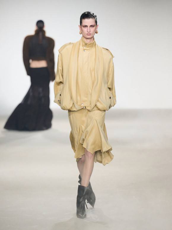 洗水重磅铜氨丝由斜裁工艺制成,轻抚悬垂在身体,行走间裙摆形成浪花般的形态,这是优雅与温柔的力量。真丝雪纺被并峙于麂皮、做旧涂层棉的款式中;皮毛一体夹克夸张而有力的肩部线条与巨型真丝雪纺裙摆交相辉映,形成刚柔并济般矛盾的张力与统一。粗纺花纱织成的大体量毛衫,用破洞与浮线暗示了创伤的痕迹,却依然予人温暖与安全感。