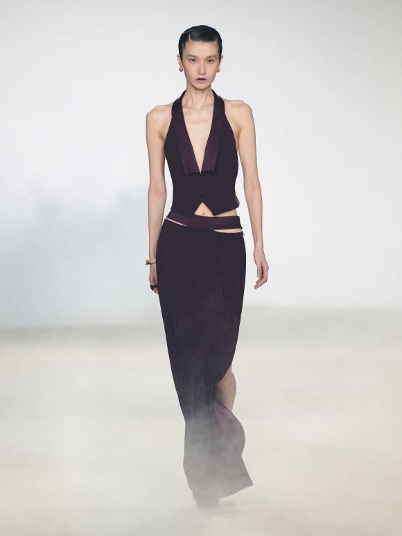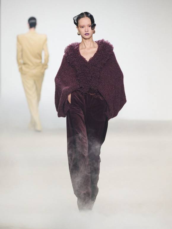 酒红色与紫色系列象征着炙热,是带着结痂的爱,夸张而圆润的肩部线条与尖刺流苏融为一体,此刻崭新的自我已然形成,她是复杂与矛盾的共同体:坚韧、脆弱与爱最终都通往智慧的自洽。
