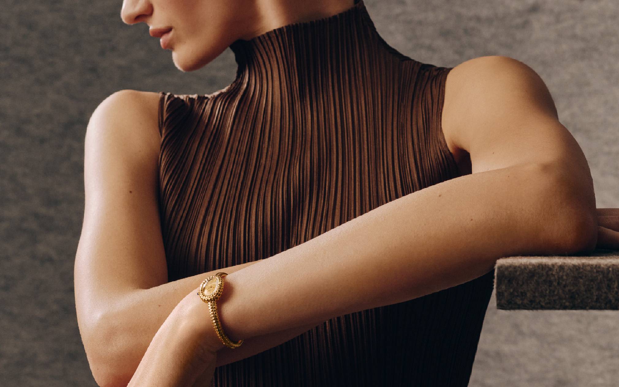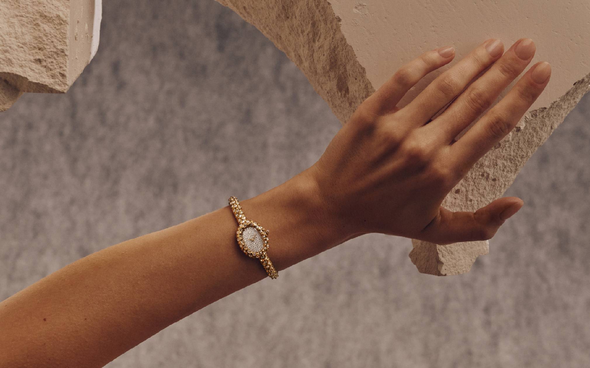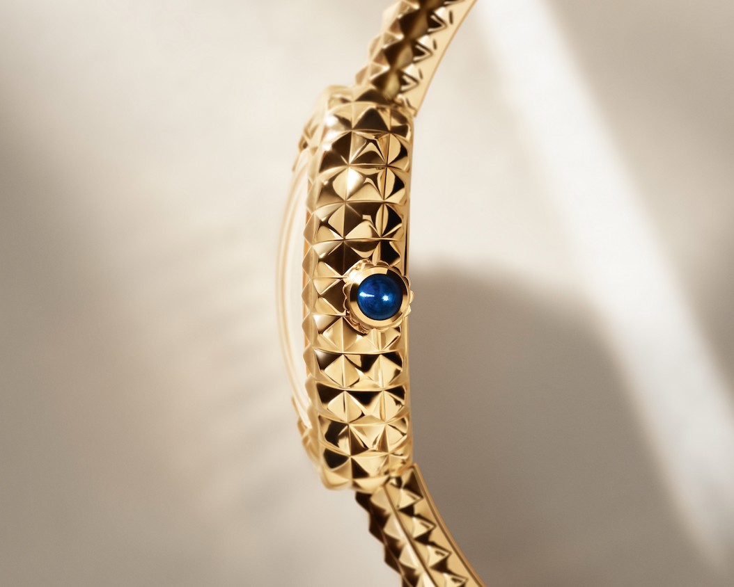 从手镯式表链到表壳以及表盘,全新Baignoire腕表通体以巴黎饰钉装饰。这些极富感官魅力的纹饰为腕表注入生动韵律与丰富层次,在凸显立体构型的同时,营造出极具建筑美感的几何视觉效果,同时带来妙趣横生的触觉体验。腕表通体以黄金材质打造,手镯式表链与表盘融为一体。为使巴黎饰钉尽可能贴合腕表的丰盈曲线,整体比例均经过精心调整和重新设计。细节之处亦精益求精,手镯式表链上的黄金材质按钮卡扣,也完美融入手镯的曲线之中。