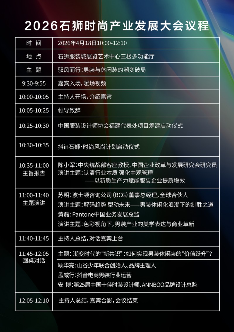 作为“中国休闲服装名城”,石狮历经四十余年深耕发展,已构建起涵盖纺纱织布、漂染整理、成衣加工、品牌运营、物流配送的全链条时尚产业生态,是全国纺织服装产业集群的核心标杆,更是全球男装供应链的重要枢纽。当前,我国男装与运动休闲装行业正处于结构性转型的关键周期,消费需求升级、场景边界模糊、渠道深度重构为行业带来全新发展机遇,同时也面临产品同质化、创新动能不足、供应链协同不畅、终端客流流失等行业痛点。在此背景下,本次大会立足石狮雄厚的产业集群优势,紧扣行业转型核心趋势,通过主旨演讲、主题分享、圆桌对话等多元形式,深度解读产业高质量发展的核心内涵,为中国男装与休闲装产业破局突围注入强劲动能。