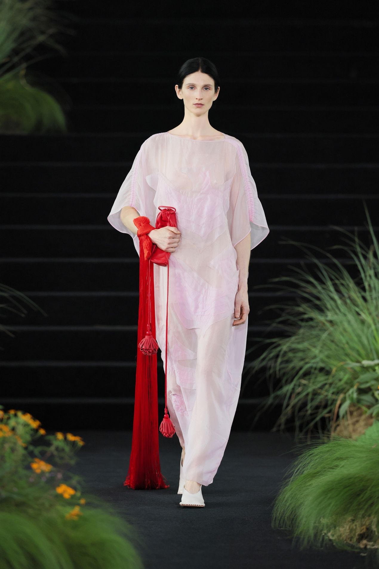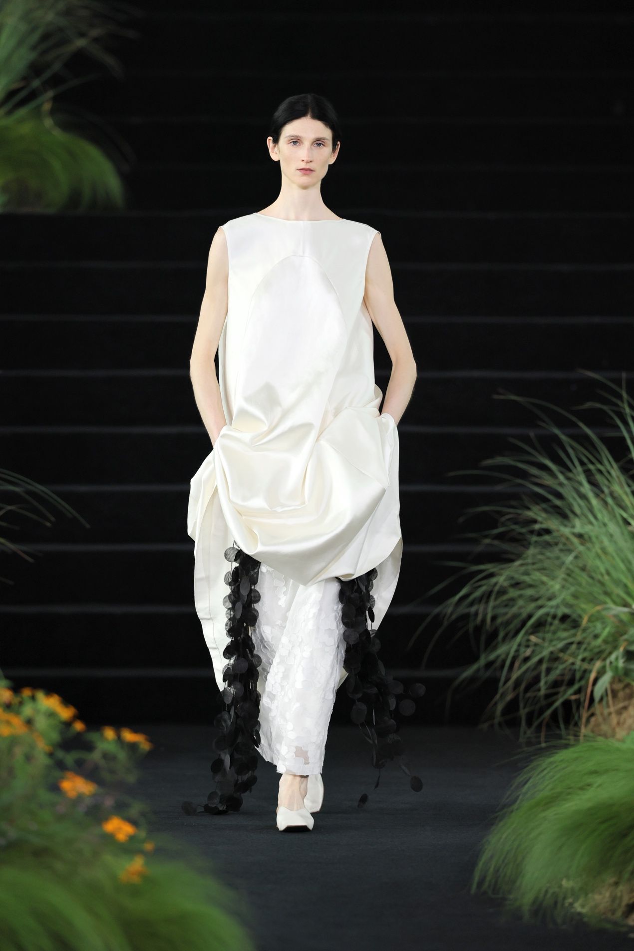 廓形上,圆形、茧形、弧线始终是品牌的核心语汇。本季首套出场造型,上衣结构展开时是一个完整而包裹的圆形轮廓,如天地未分时的混沌一体,穿在人身上时,轮廓又随身体回归收合状态。裙身保持轻盈悬浮,与内层裤装形成层次对比。这些弧线包容身体,却不刻意勾勒或束缚。衣服与人体之间,始终留有一层空气可以流动的空间,正是这层空间,让女性气质的游走得以发生。