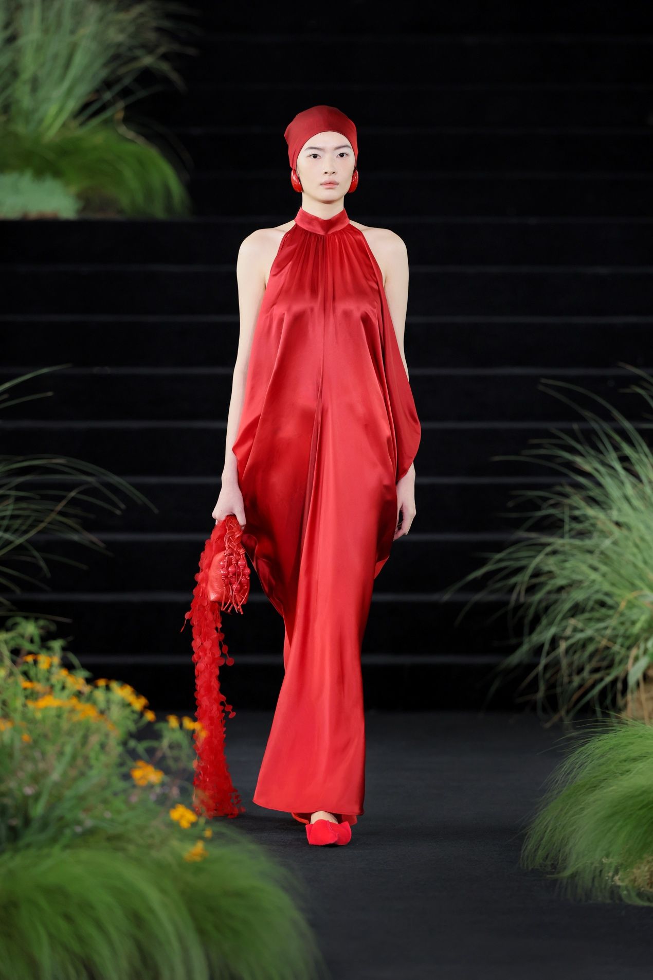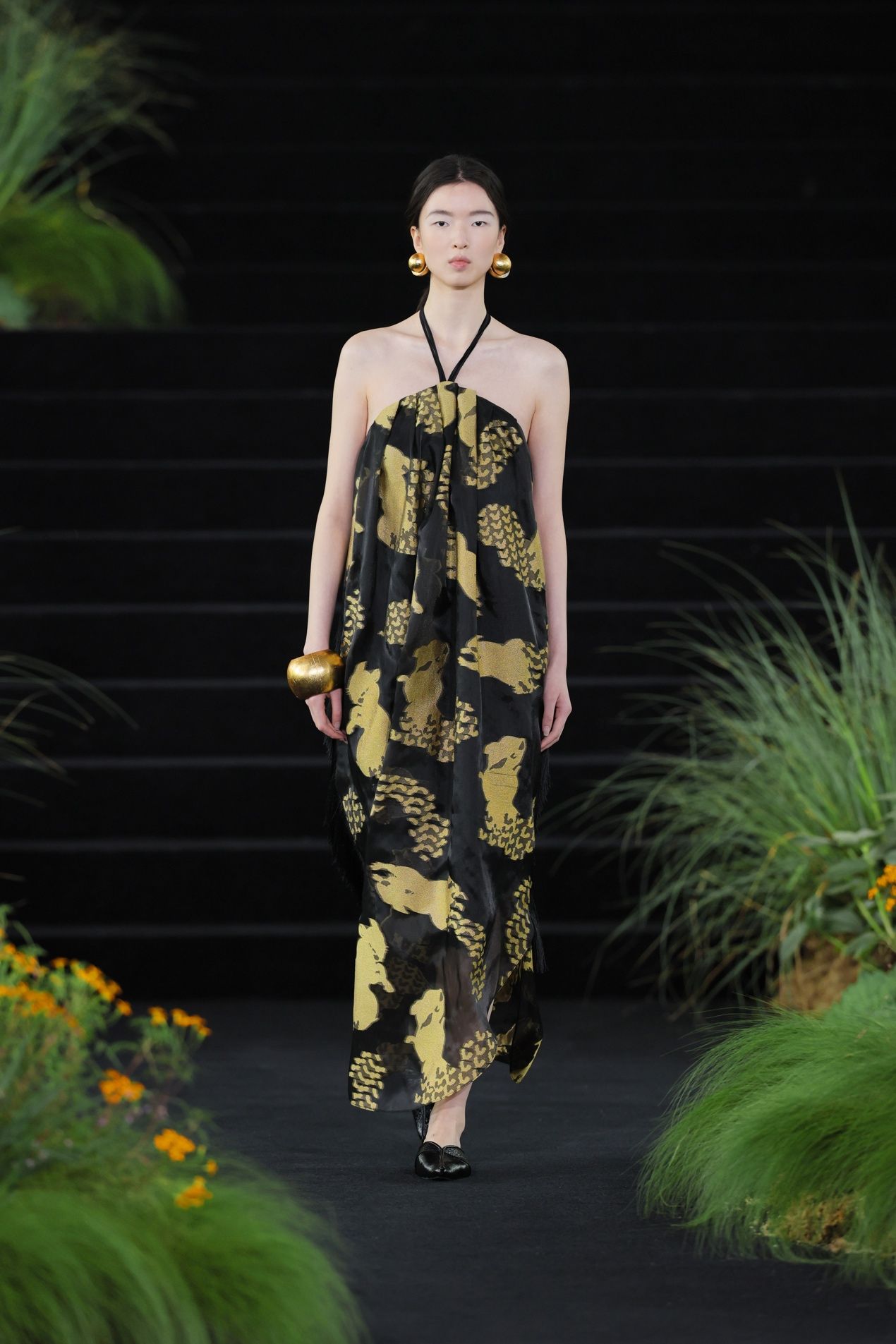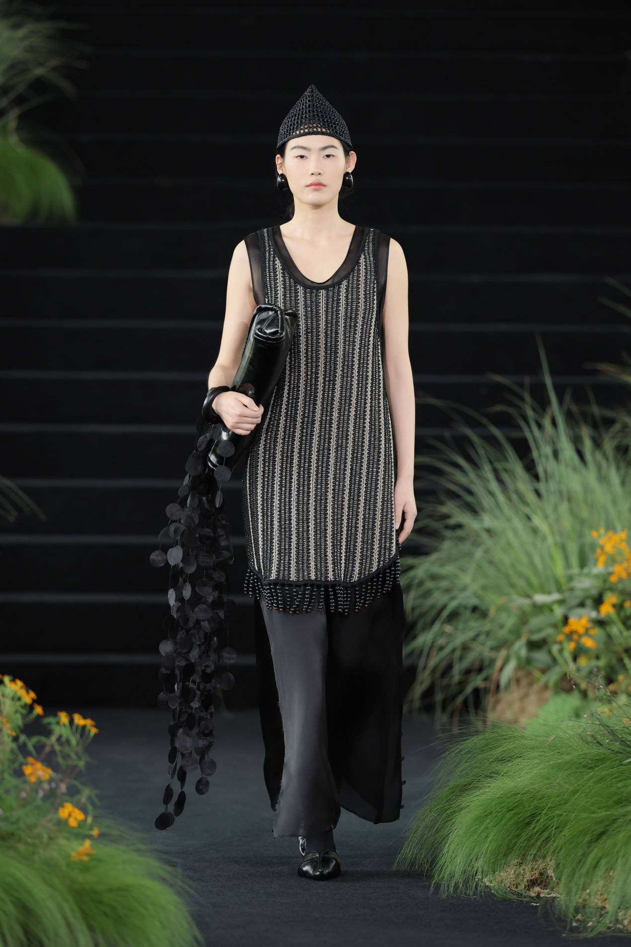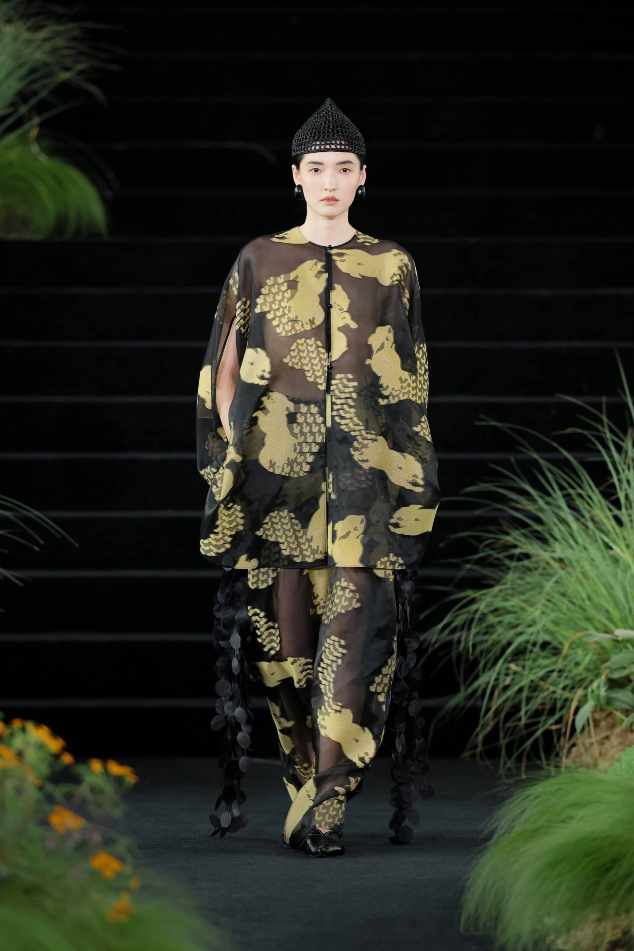 而后水意渐收,换上草木的青绿和亚麻的柔黄,色彩开始有了林间土木的重量。一袭灰绿色的缎面裙装到来,宣告森林由白昼进入夜晚,那定是月色如银,在树叶油亮的表面跳动。条纹针织罩衫下摆坠有黑色木球串,随模特行走发出声响。夜色中,金色松鼠爬上面料,在动态中反射出不同方向的光线,仿生的效果从具体的形,延展到林间忽明忽暗、忽静忽动的生命韵律。穿上它的人,仿佛正穿过一片深林,松鼠在视线远处一闪而过,衣身替她记下了这一切。