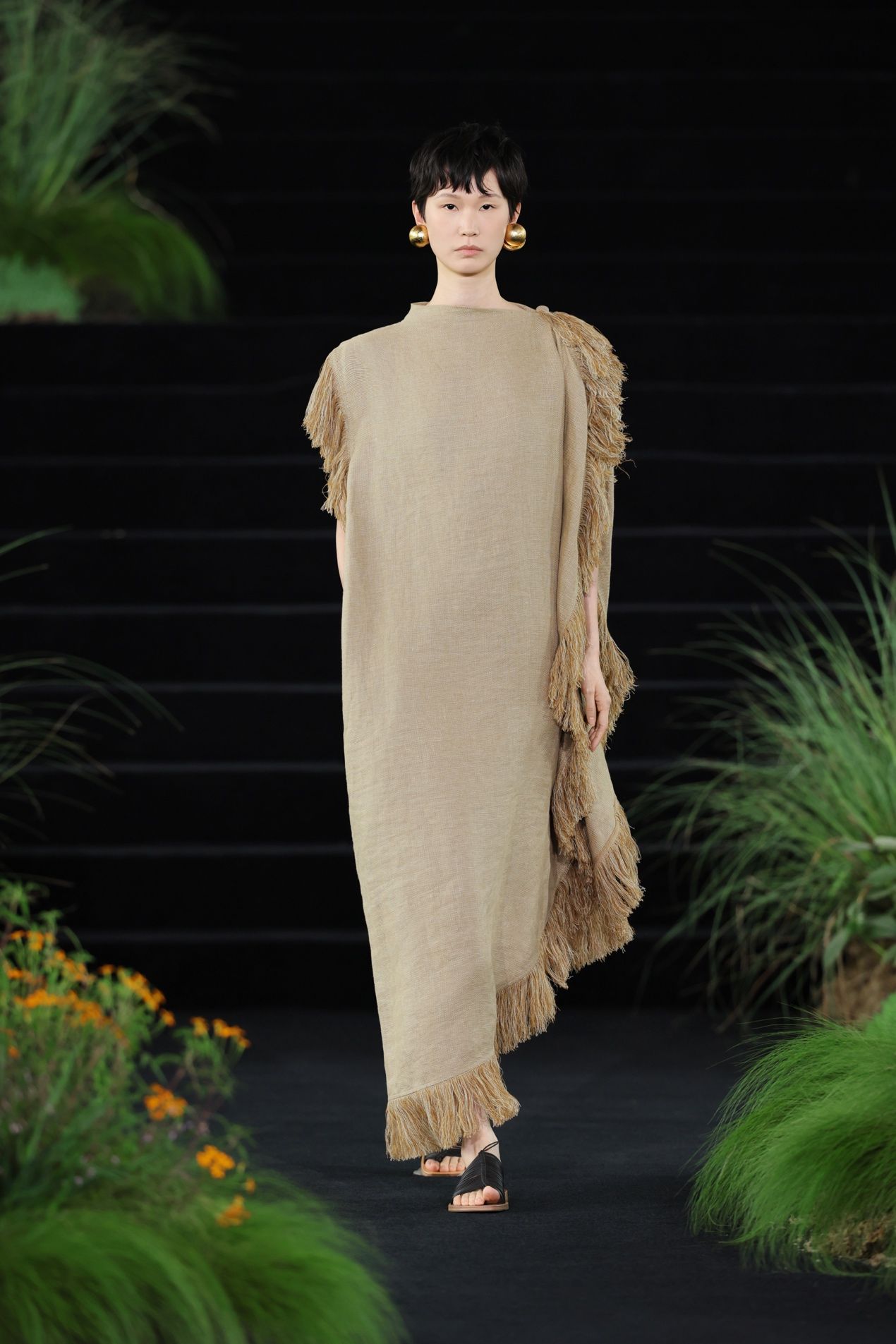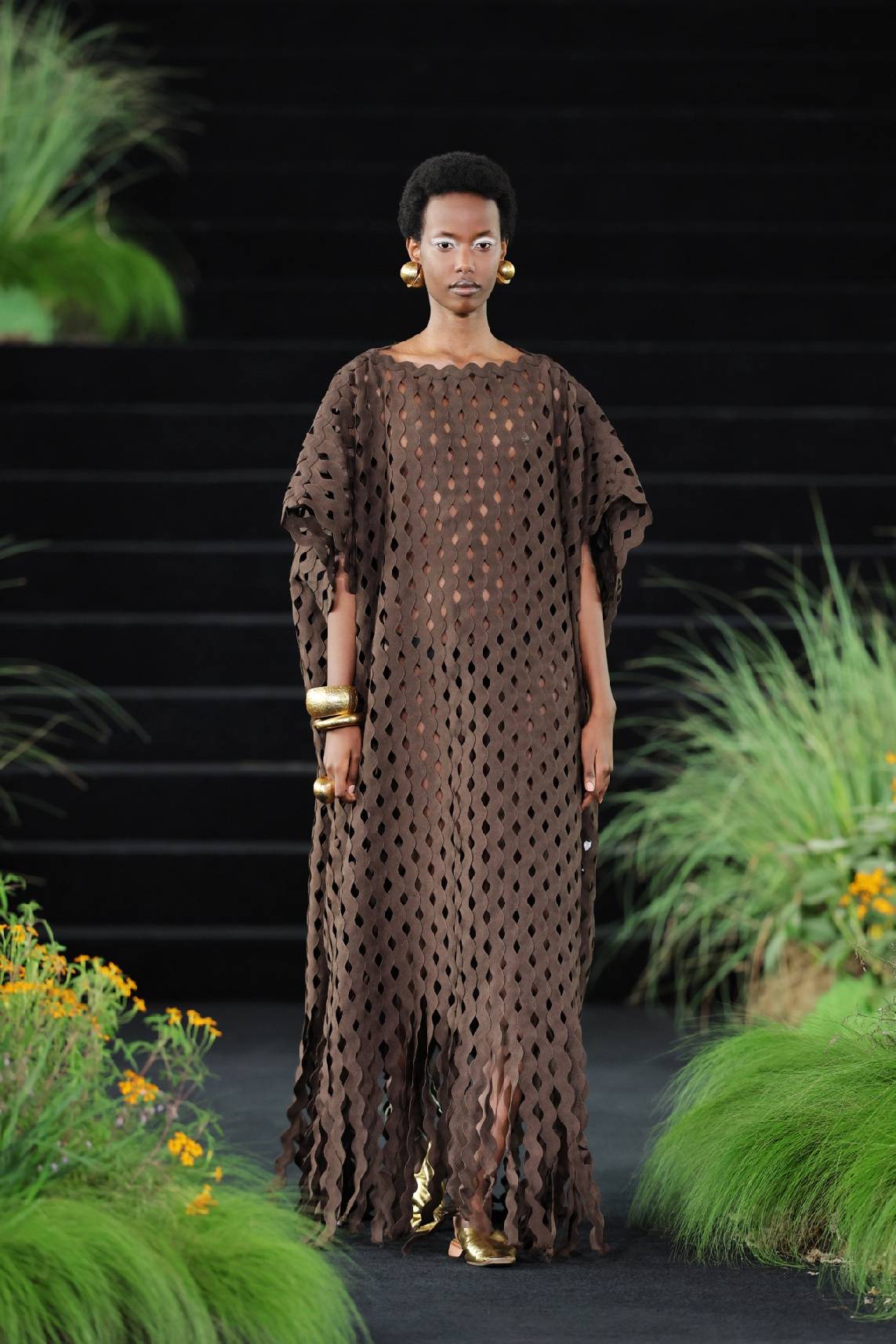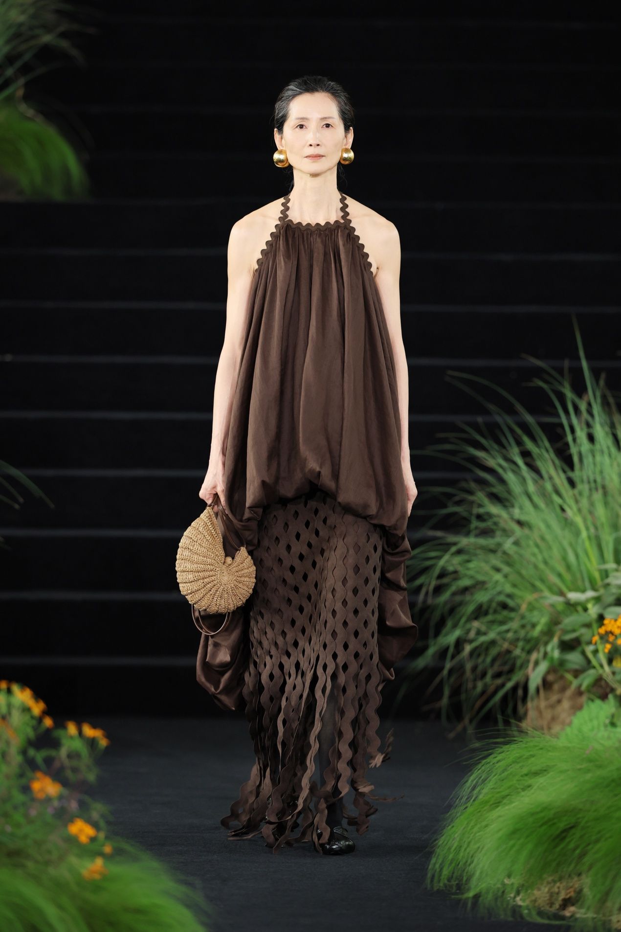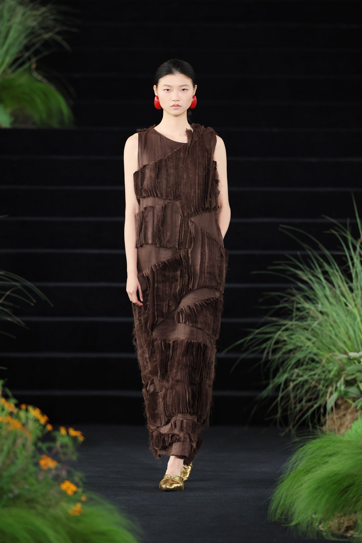 旅程的尽头,是黄昏时分光落在大地上的颜色。褐色碎布排列于裙装之上,被集体切割出大块凹凸,模拟树木的皮肤。但这一章节并非回到林间,而是描摹风与鸟。画面独剩树干时,鸟已乘风而去,这正是东方的审美意趣。更多暖褐色的衣料在空气中层层展开,廓形愈发松弛,宽阔的衣摆、延展的侧幅、开衩与不对称的层叠结构,让空气自由进入衣身,在步履间将衣摆托起。仿生走到这里,已不再需要模拟任何具体的生灵,衣服本身已经成为一阵风,一声鸟鸣的回响。