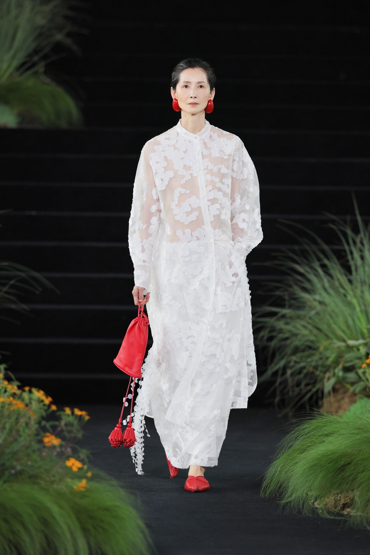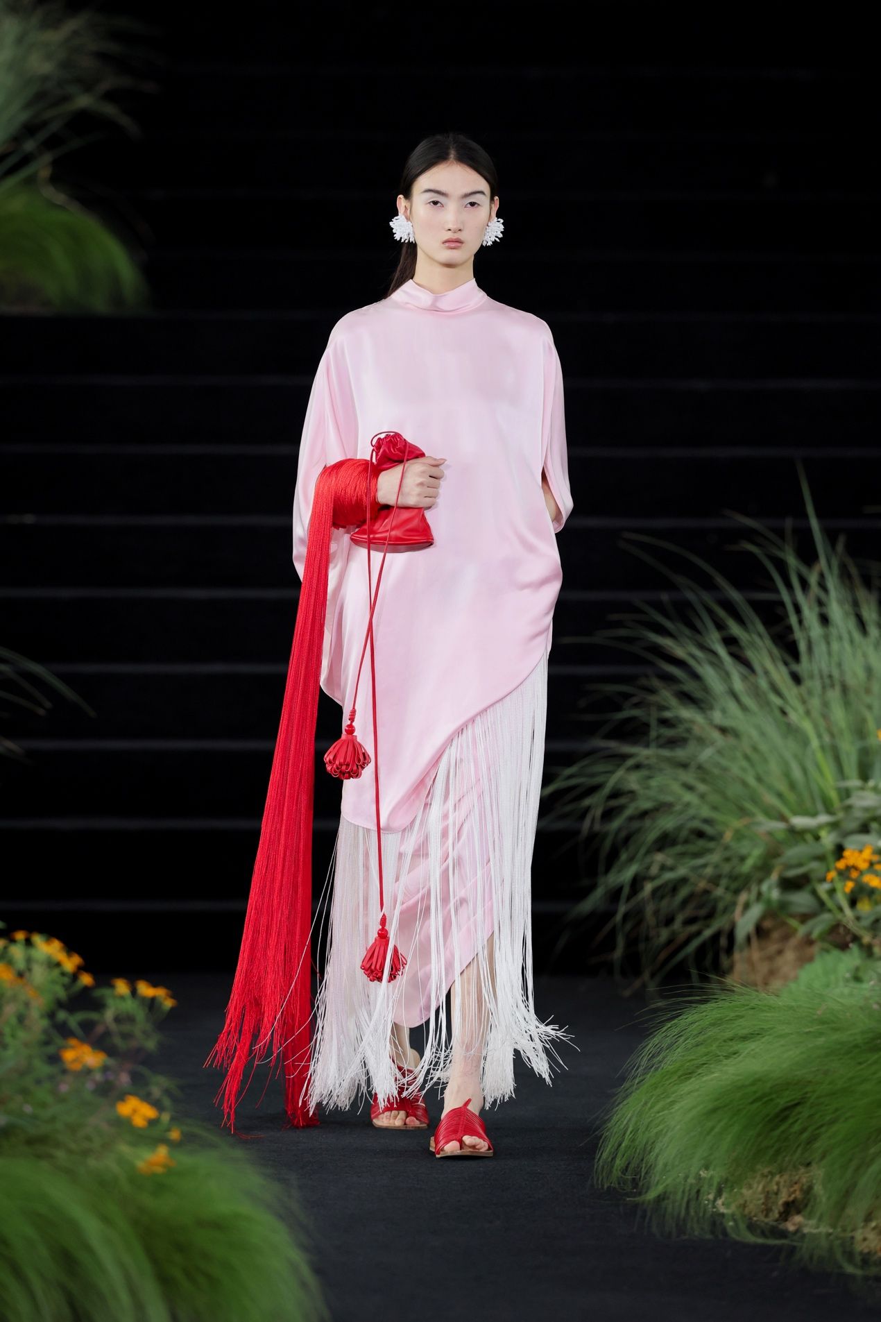 之后的几套造型继续保持黑白,但我们已由林入海。在深海极处,光被隐匿,黑白花稿正是捕捉了海底视角。那些静默的生物呈现白色,是模拟了深海鱼类的自发光器官,转念一想,又像人类的梦——据说大部分人的梦都没有色彩。随着高度上升,光线引入,视界有了色彩。先是两套粉色造型过渡,模特手持红色流苏包款款走来,有如两株珊瑚。由此,色彩开始最大幅度的展开,一袭蓝袍之上,缤纷笔触虽无具体轮廓,却写意呈现热带浅海内,藻类、珊瑚、鱼群的生态世界。三层分离式组织,利用抽绳原理,中层织线的收缩使表面产生起伏肌理,宛如水波在衣身上缓慢生成。印花与织物结构叠加,使视觉产生如同在水中扭曲模糊的效果。红色水母化作连衣裙,而一条绿裙之上,彩色流苏模拟海藻,随模特步履而动,让周遭的空气变成了它们飘荡其中的海水。