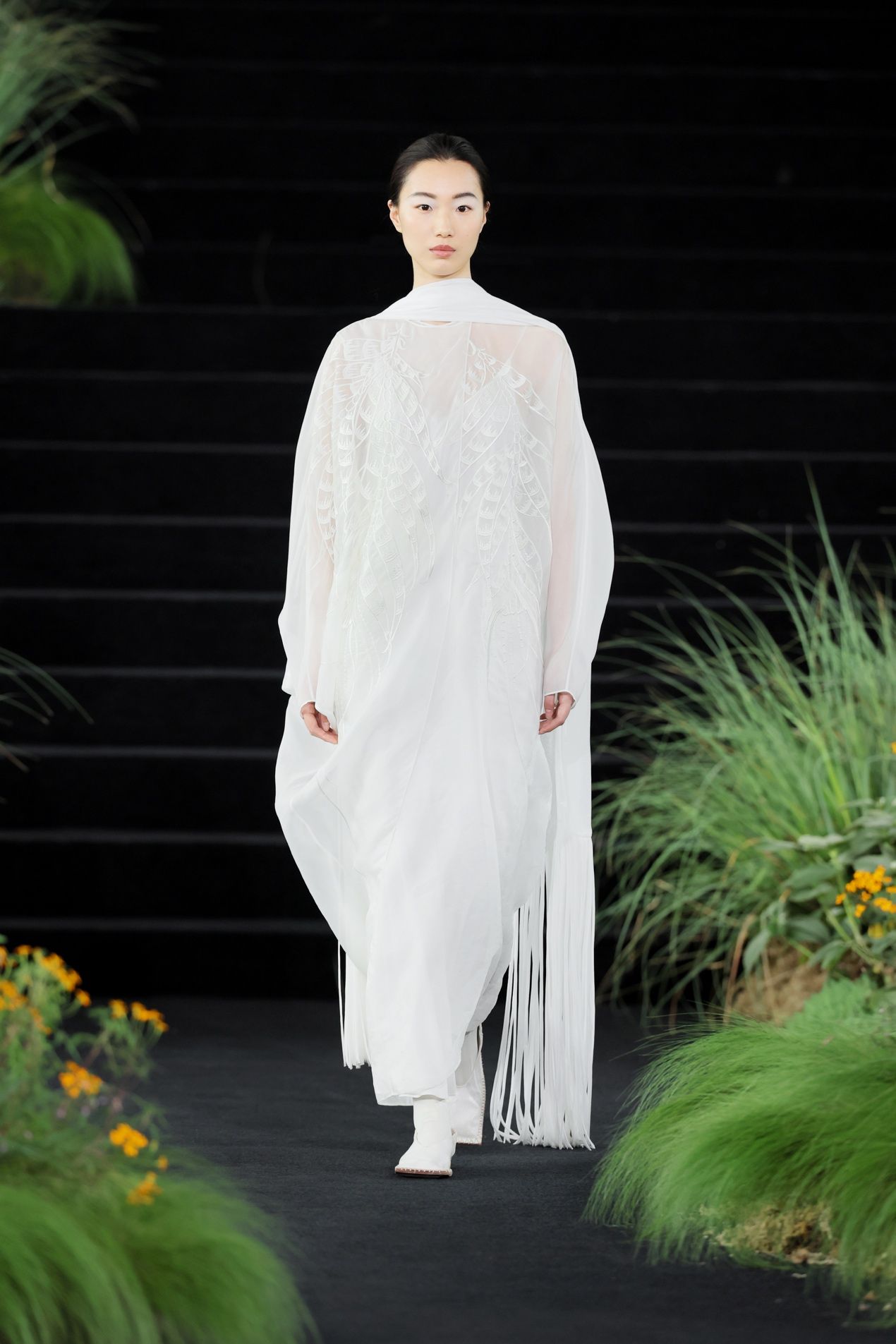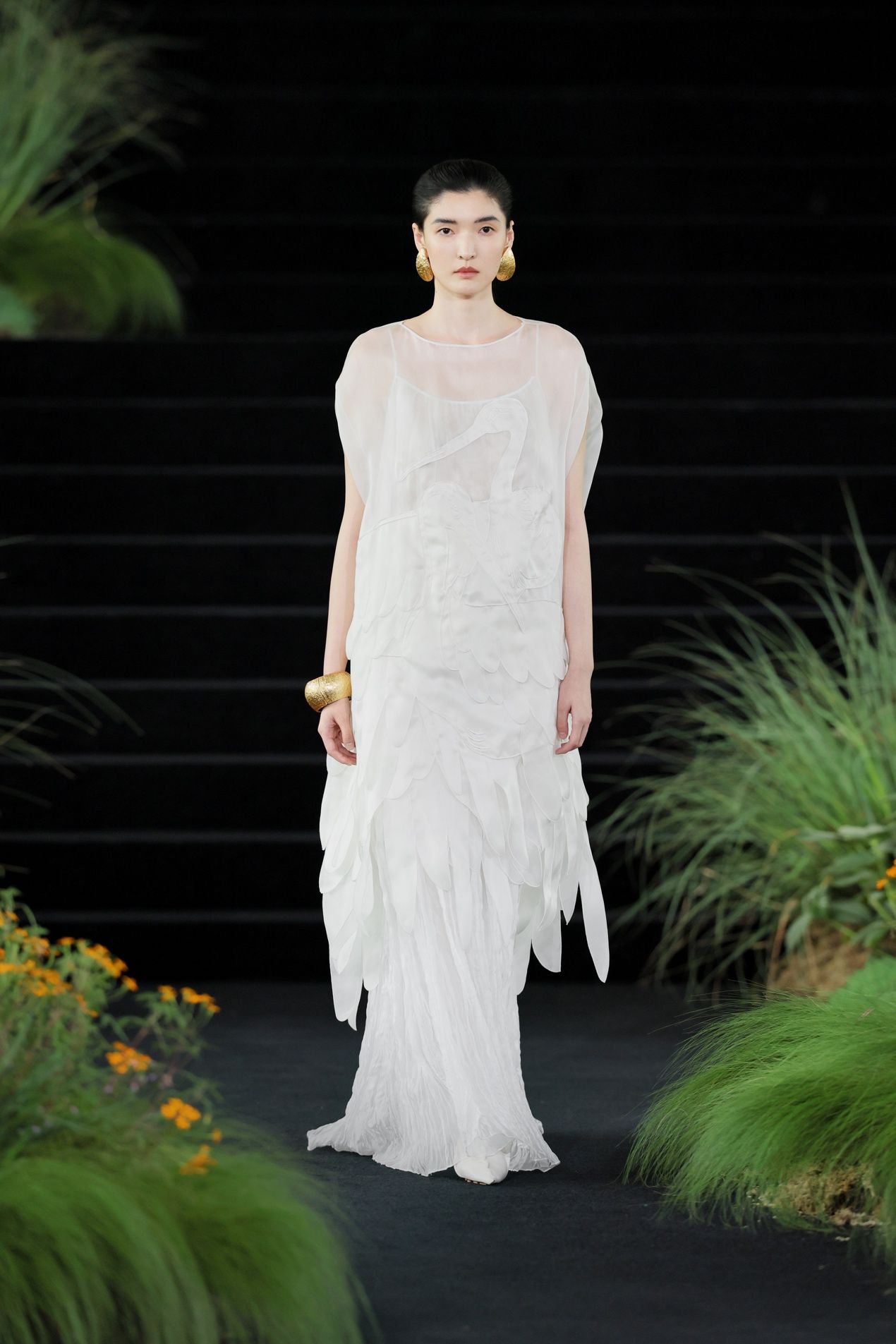 最能代表ZHUCHONGYUN女性形象的是“白鹳”。第30套造型中,两只白鹳相互依偎,羽翼由多层欧根纱重叠出朦胧效果。下摆处的每层羽毛皆为单独设计,克服了多重对位的困难,才达到行走时自然翻飞的效果。白鹳这种生灵,风雅高洁,身姿轻盈如一笔淡墨落在水面,却绝非柔弱之鸟。它有力,能远行,在远古图腾中甚至象征着胜利与威权。