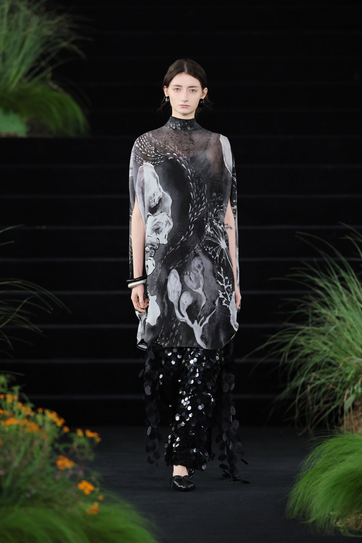 苗系列也在这一篇章出现,共庆生灵之美。黑色真丝欧根纱上,圆形银色贴布内含精细刺绣,图案来自苗族古歌。传说蝴蝶妈妈与“水泡”游方相恋,生下了十二圣灵,它们便是刺绣的主角。光线照耀下,生灵图案的反光强于贴布本身,仿佛在一个个圆形的孕育下随时就要诞生,饱含万物伊始生机勃勃的张力。