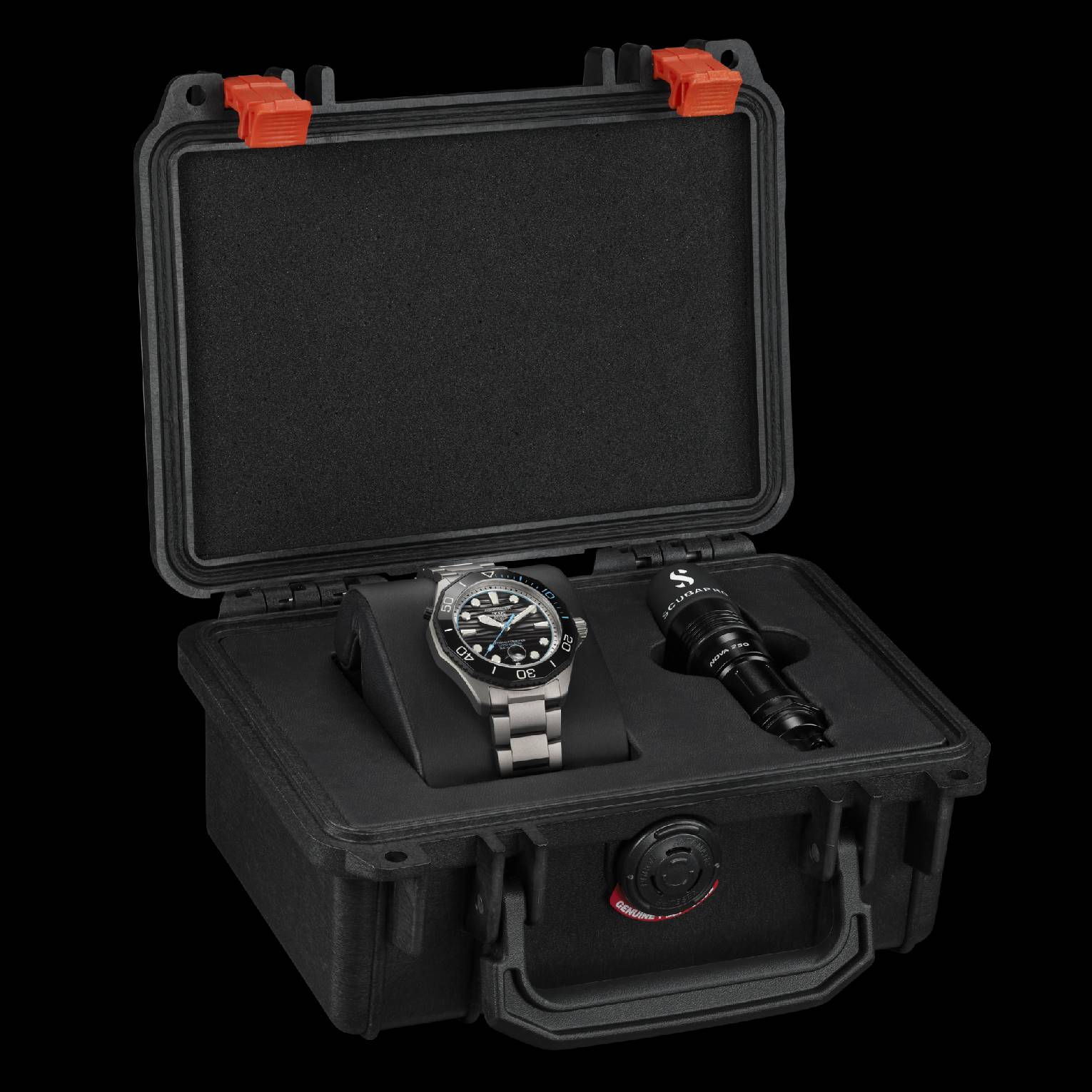 这款时计配备超安全定制表盒,并随附一支专业级应急手电筒。表盒集防水、抗压、防尘与防腐蚀性于一体,与其守护的腕表一样,拥有出色的坚固耐用性。