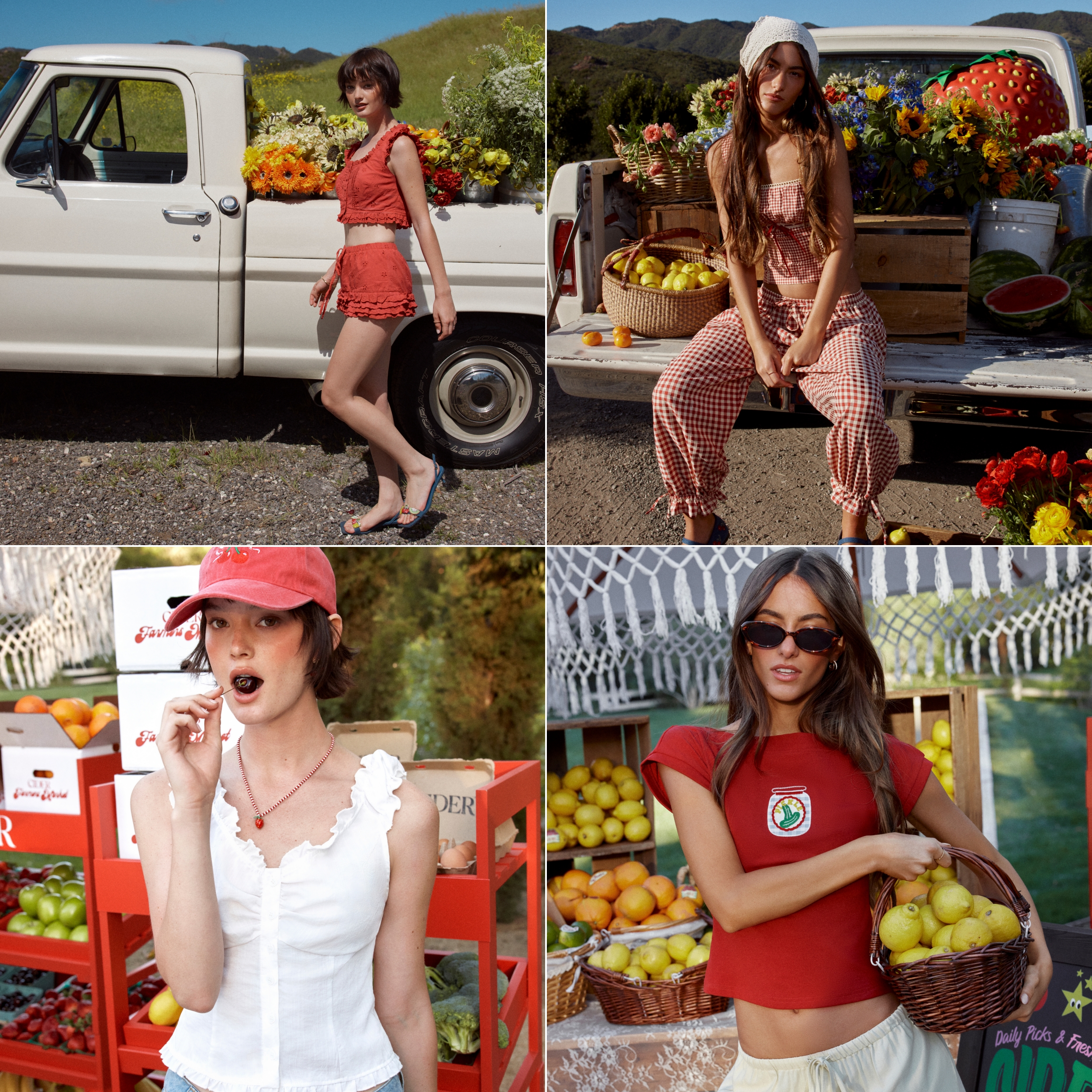 与首店同步亮相的“Original Farmers Market限定系列”,则进一步将品牌美学与门店所在地的文化做了绑定。该系列以市集文化为灵感,融入趣味食物图案、棋盘格元素,通过钩针编织、刺绣等手工细节呈现,涵盖服装、泳装及配饰单品。它不是简单的“洛杉矶限定”标签,而是将Farmers Market近百年的生活气息,翻译成了CIDER独有的玩味设计语言。