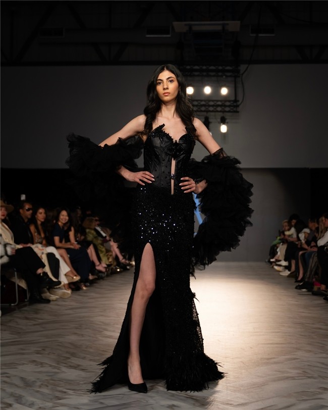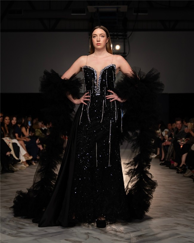 · 高定晚礼服(Couture Eveningwear):以精确剪裁建立轮廓,通过结构控制与手工工艺,使服装在静态中呈现雕塑感,在动态中形成流动;光泽面料与反射材质的运用,使每一件作品在不同光线下呈现变化,强化视觉层次与空间感。