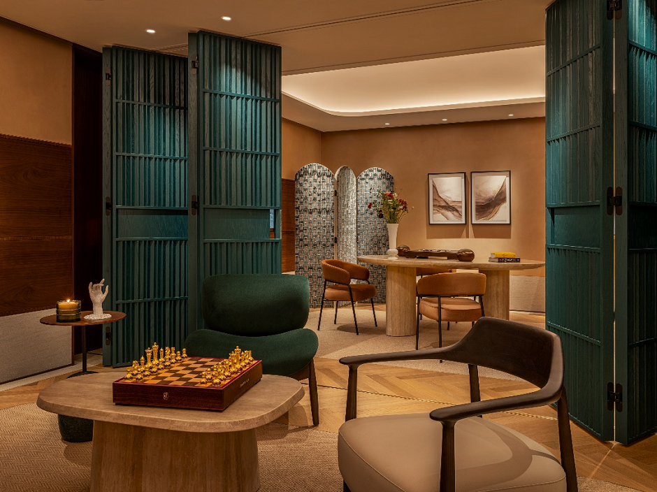 循动线深入,顾客可步入传承区域。空间以温润柔和的琥珀色为基调,搭配人字纹木作的细腻肌理,层层勾勒出沉静内敛的华贵气韵,于简约之中尽显丰盈质感。
