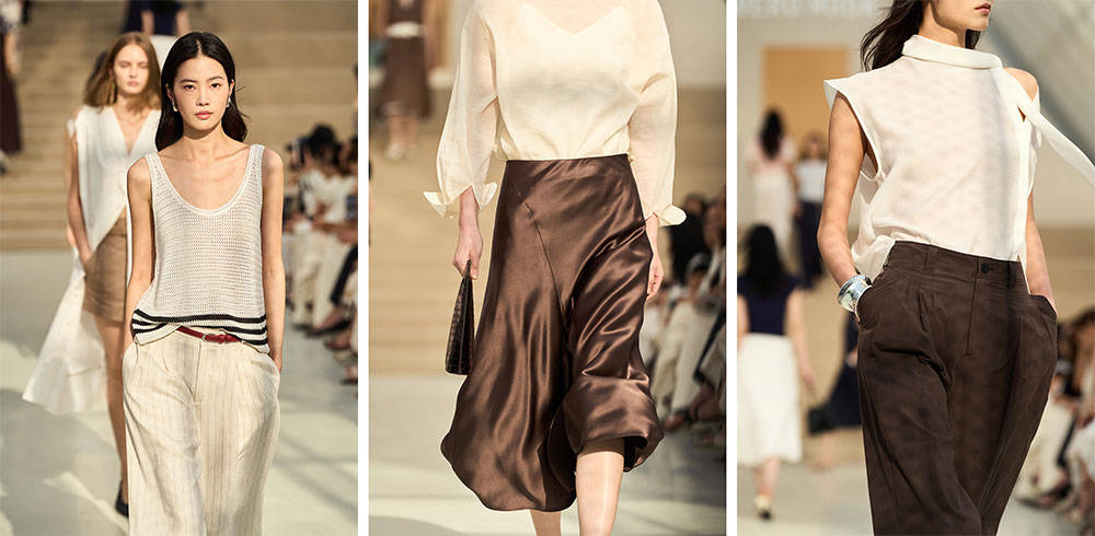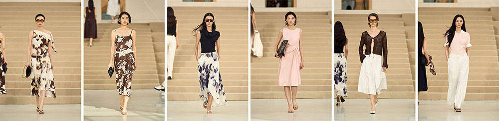 在这一季26春夏系列中,设计语言随品牌同步升级。简练之间,尽显细节的张力,无论是局部的堆叠、抽褶或是线条的转折,都如同书页间逻辑严密的行文,在轻薄的材质上留下了值得推敲的伏笔。服装色彩回归至永恒的视觉基调,以本真白、经典咖、午夜蓝等主色系贯穿,在柔韧且具有流动性的材质之上,勾勒出从容的身姿。偶尔浮现的艺术印花,在黑白分明的底色之间,注入随性而至的灵动感。