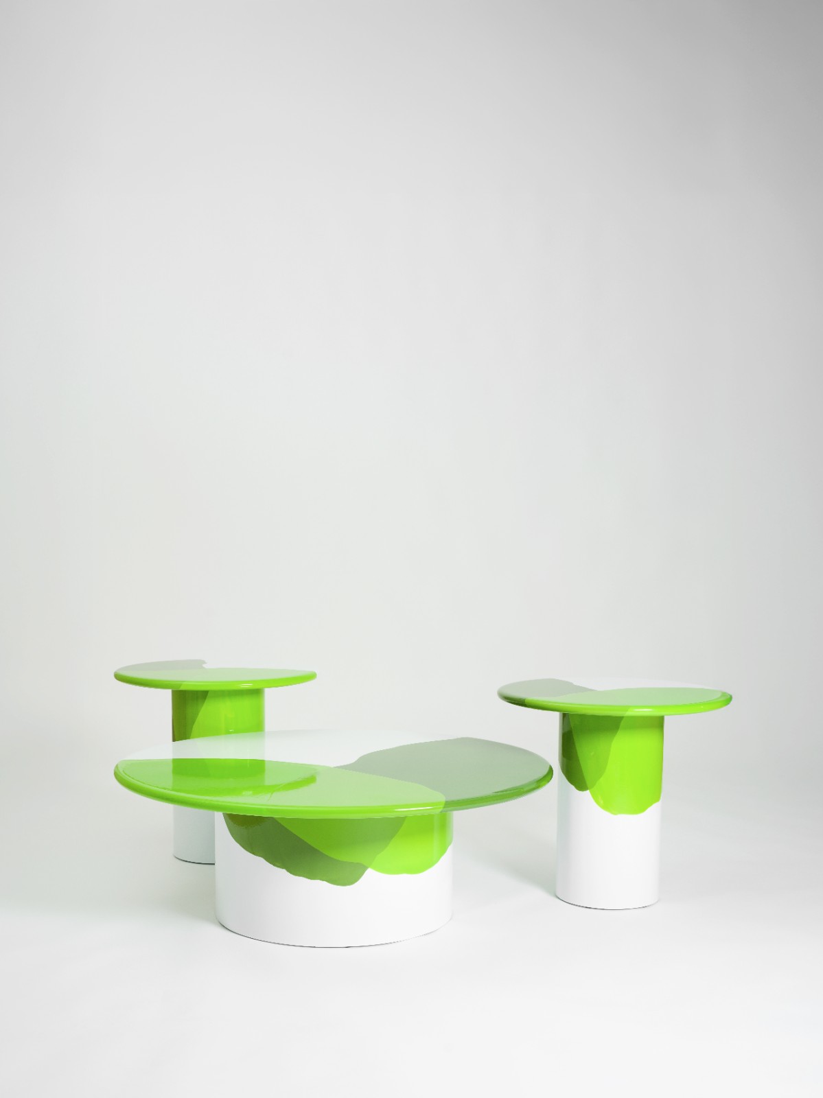 本次 Patrick Jouin Édition 系列中,DROP 边桌与咖啡桌以旋压钢材为主体,搭配品牌专属手工浇筑珐琅釉面,经由珑骧品牌基因的全新演绎,桌面以水彩般的渐变层次,晕染出品牌标志性浅草绿与经典传承绿的灵动色块,成为视觉核心。同系列的 OLO 扶手椅亦同步完成品牌化重塑,皮革包边以浅草绿做染整处理,以细腻的定制化细节,为整套作品赋予专属的珑骧印记。