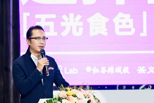 UCCA集团艺术总监兼UCCA尤伦斯当代艺术中心副馆长尤洋在“选择的游戏:‘五光食色’艺术互动体验展”新闻发布会现场发言,鸿鹄里文化艺术空间小剧场,2023,图片由UCCA Lab提供