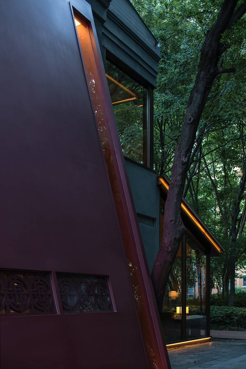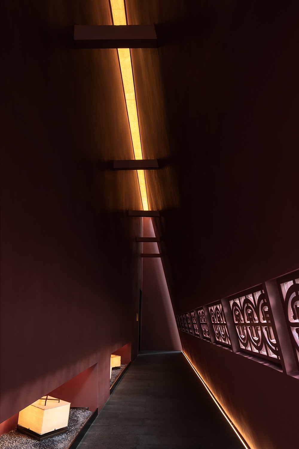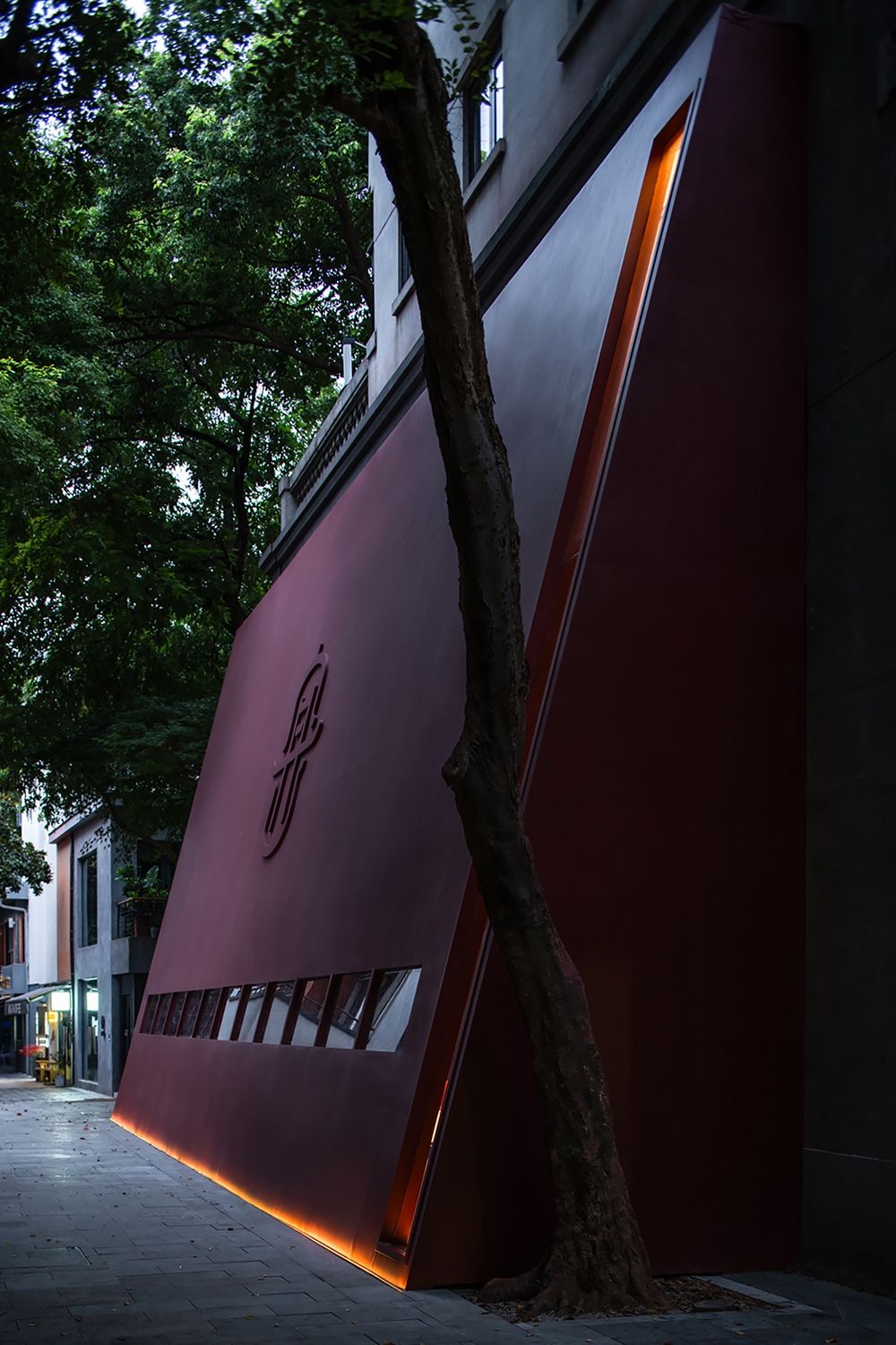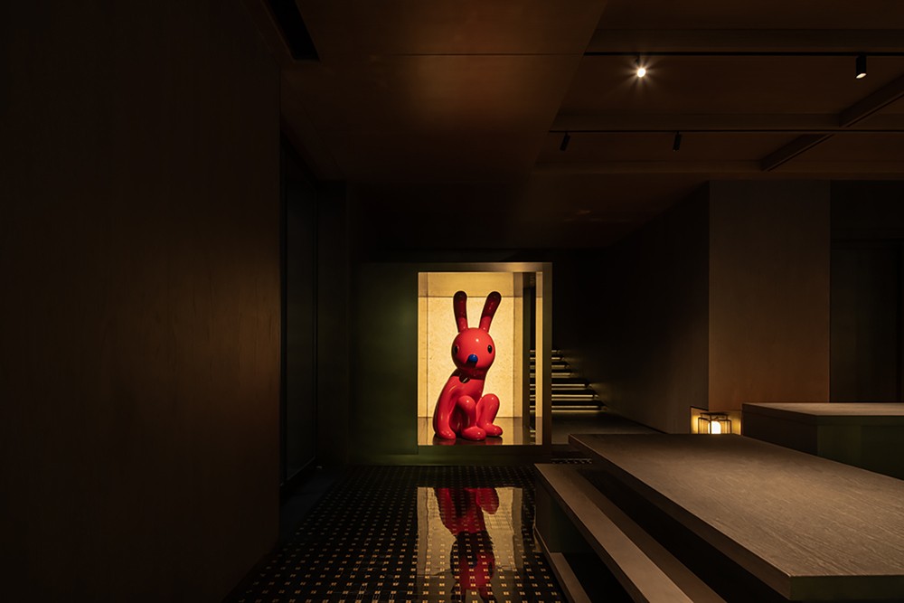 一抹丹砂,居于前,形似裙裾,在青灰色的画布中缓缓游行,亦步亦趋,带人入画丹青。赋予动感的几何门脸造型,搭配朱砂的浓郁色彩,是品牌标志性的的整体呈现。入口的巧思妙想,长而幽深的走廊,缓缓透露的天光,让人犹入画廊,揭开画匣的瞬间,已入丹青江夏。