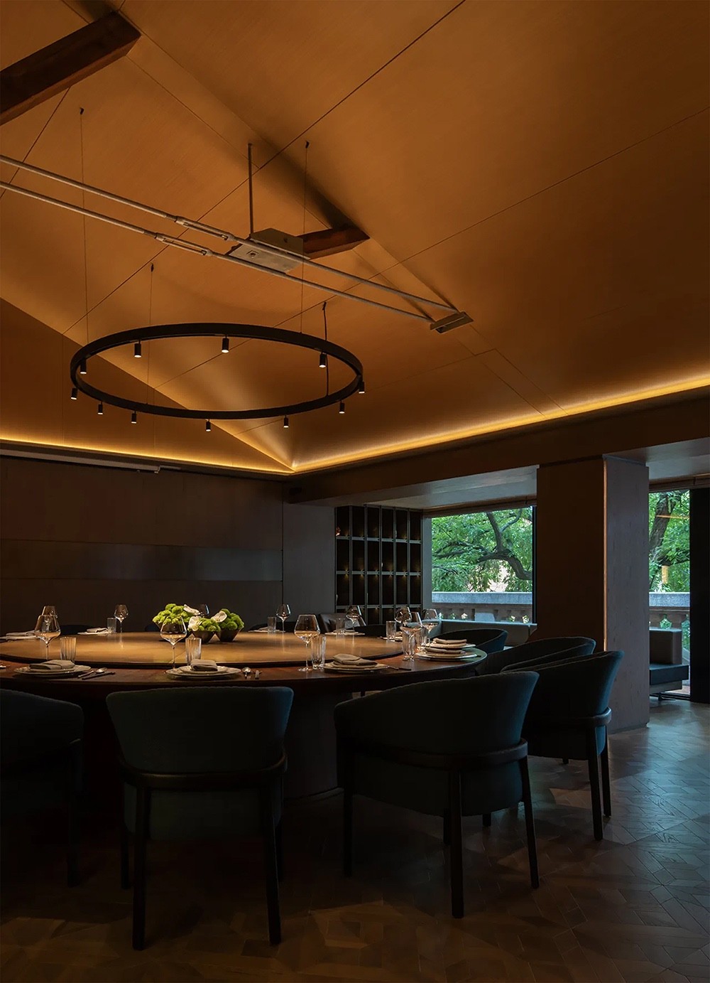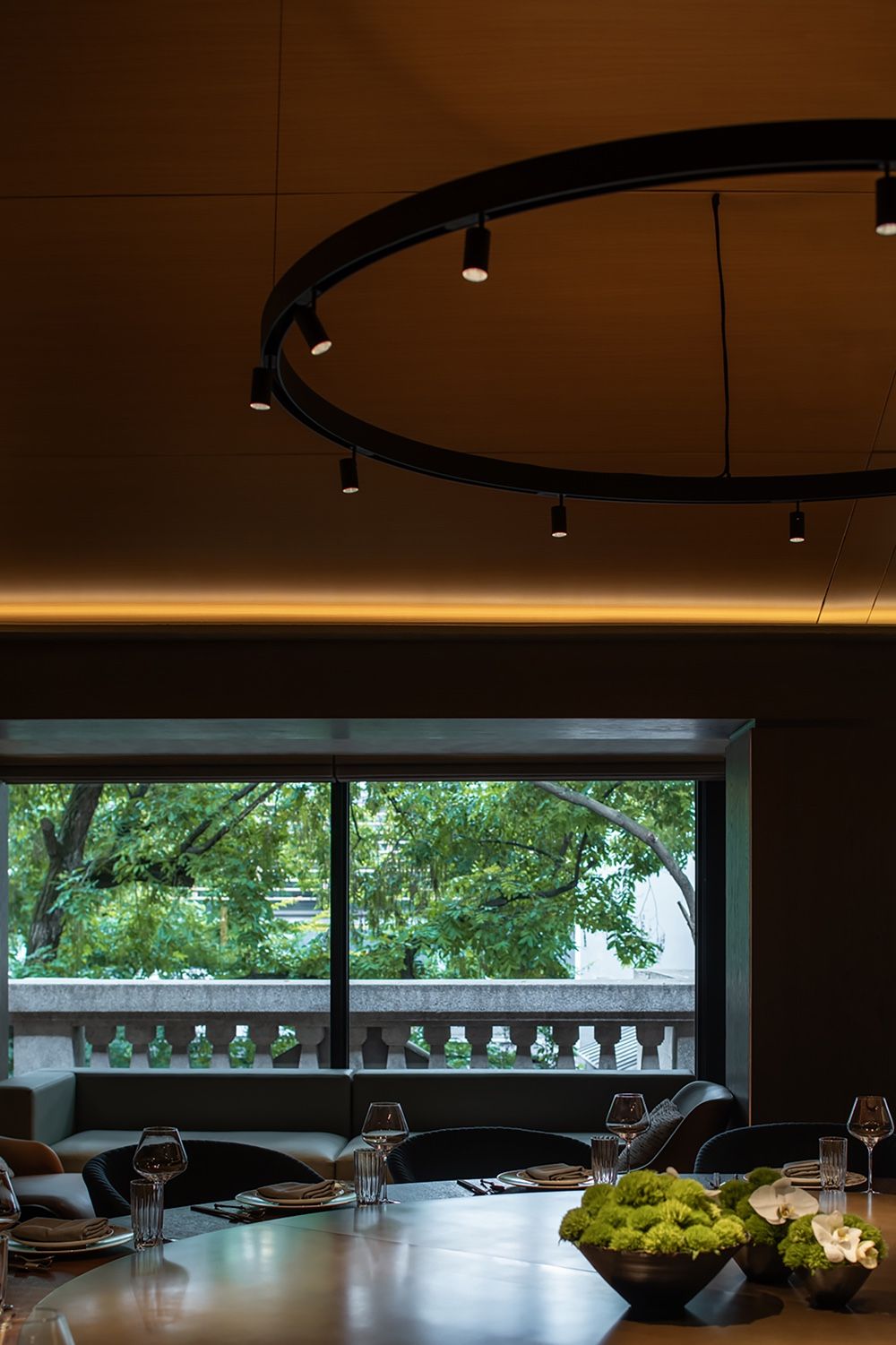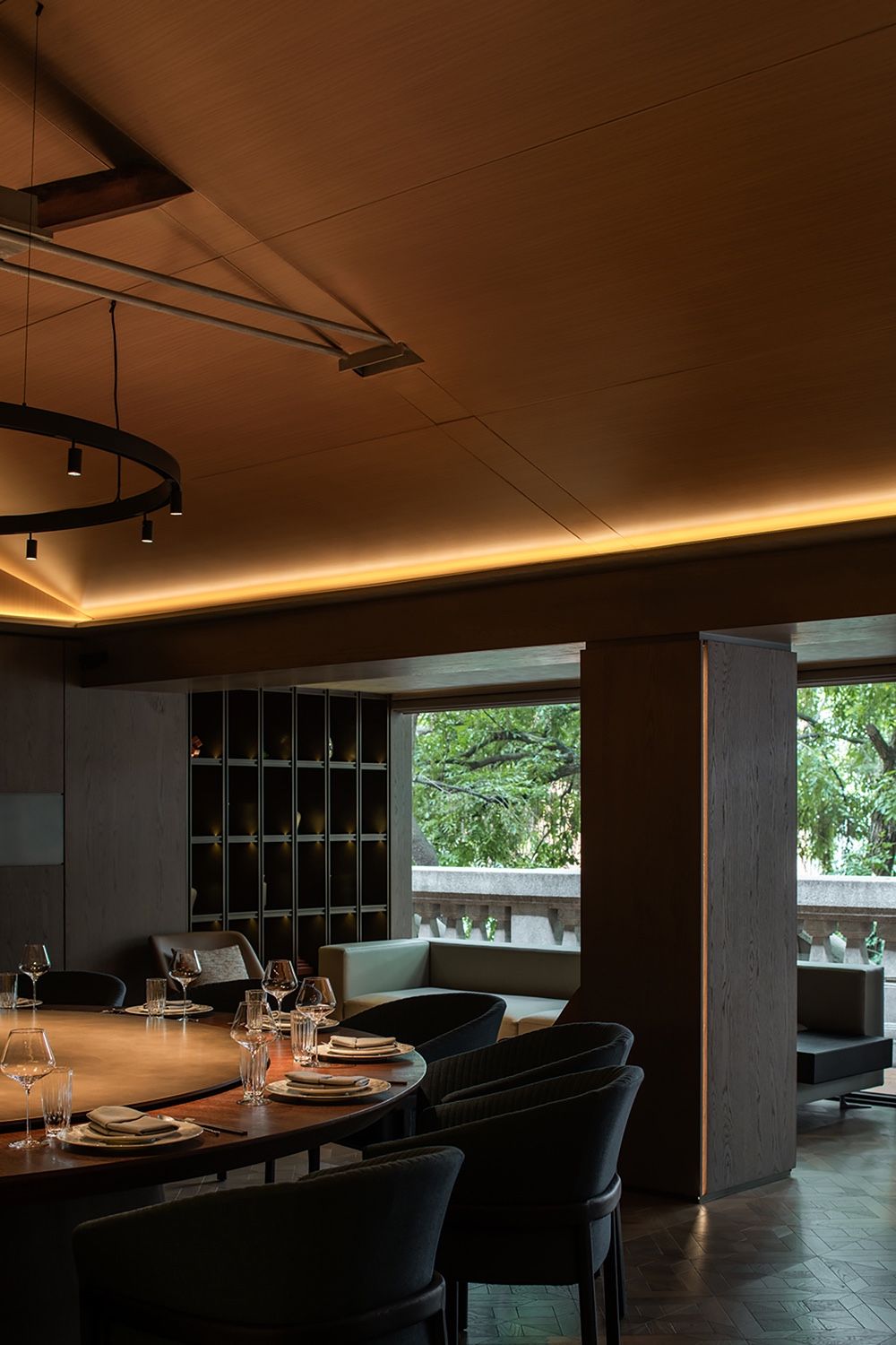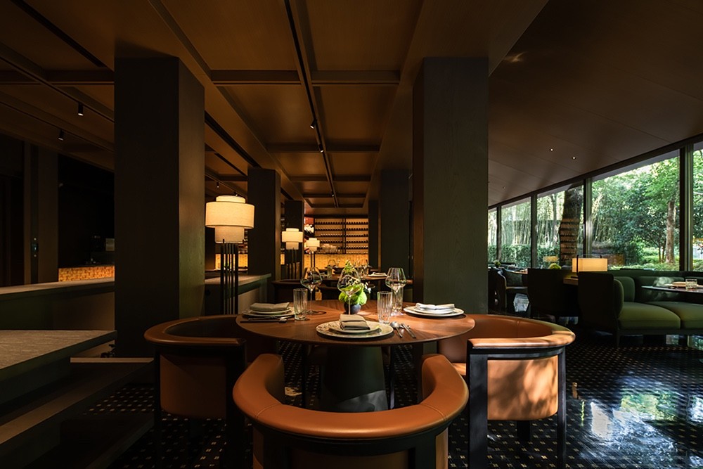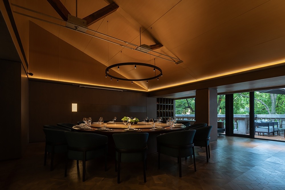 三层的布局呈现环绕式,采取了中式园林当中的复廊形式,以长廊连接中心包间区域和露台,移步易景,共联江诗缱绻,画幅绵长。