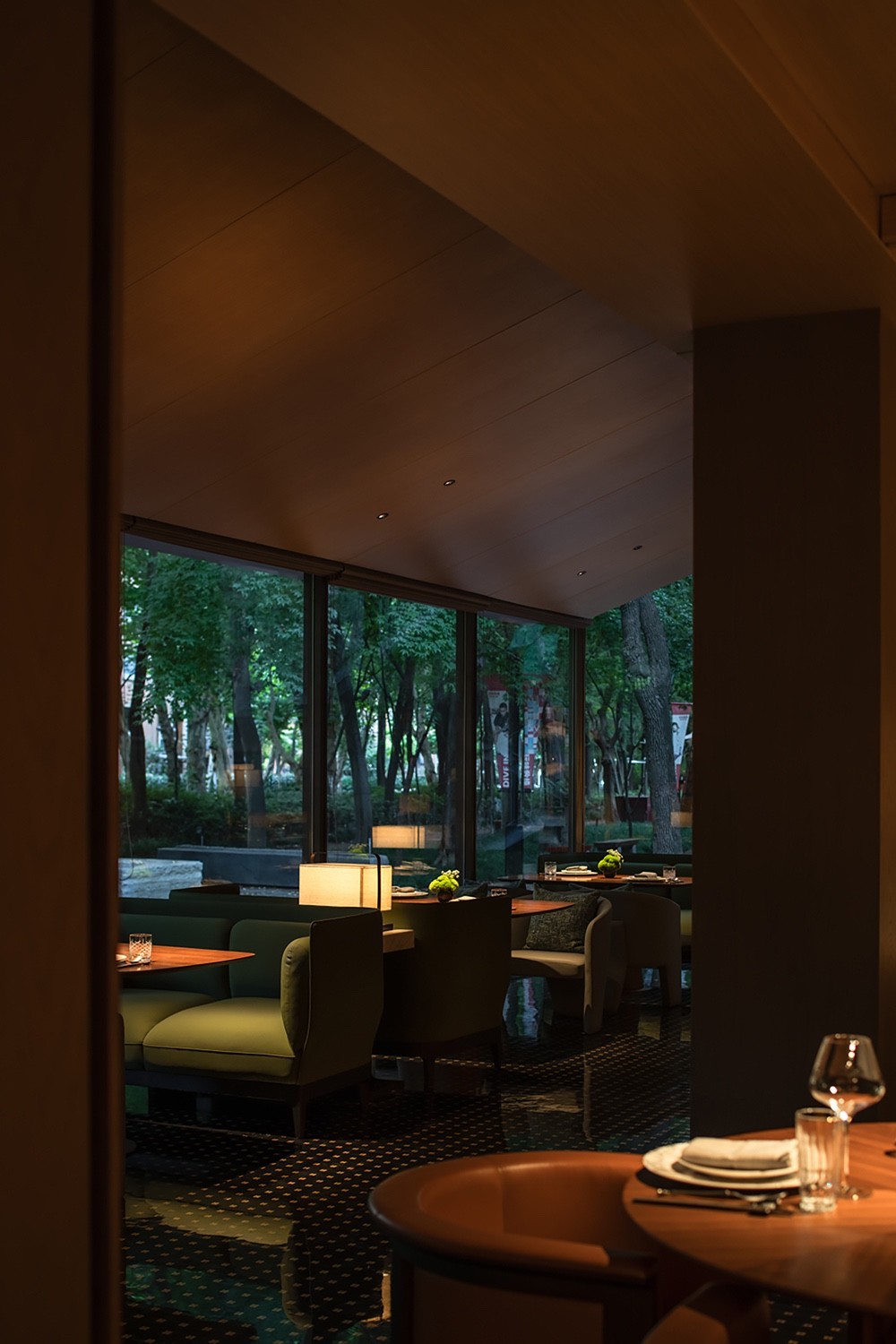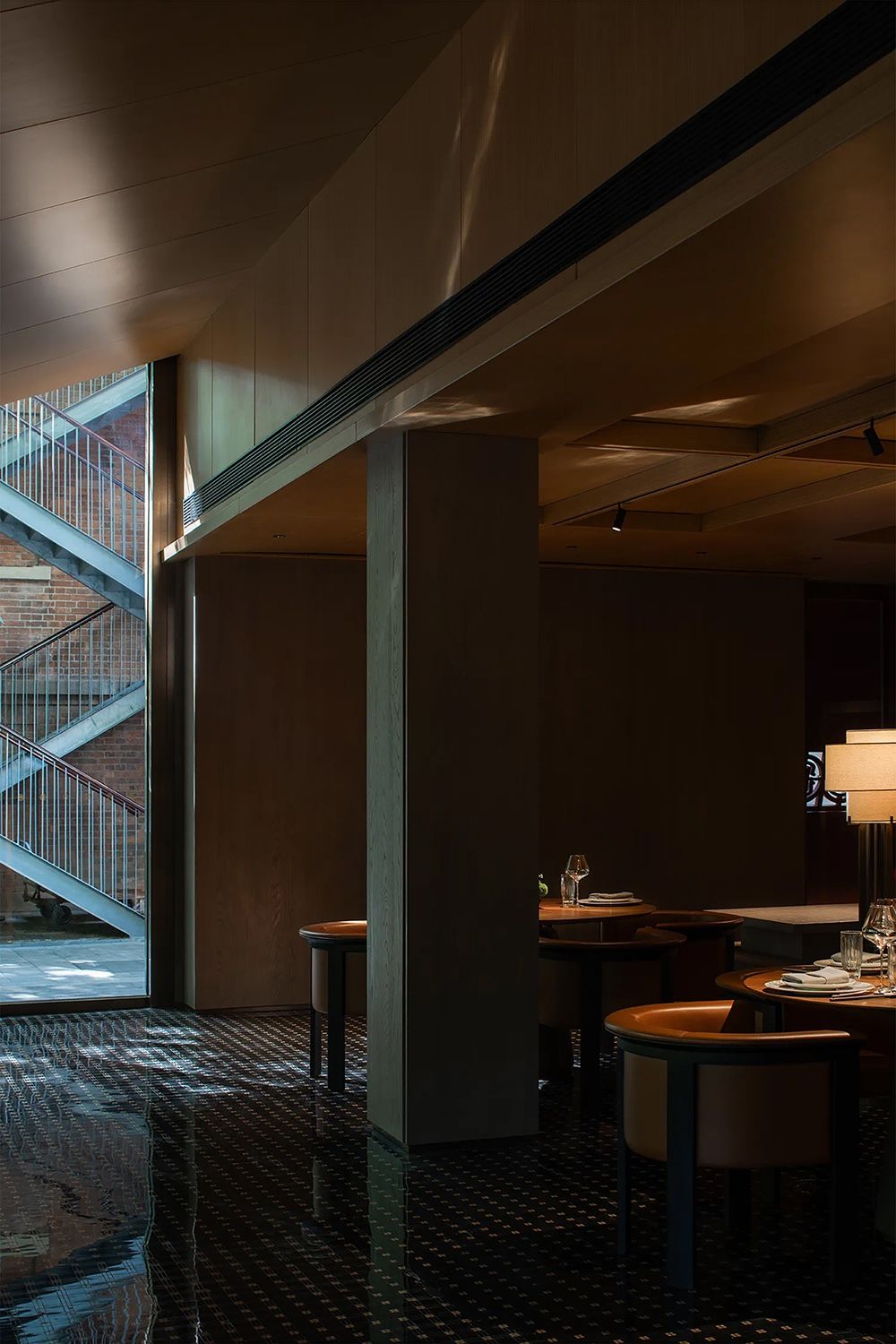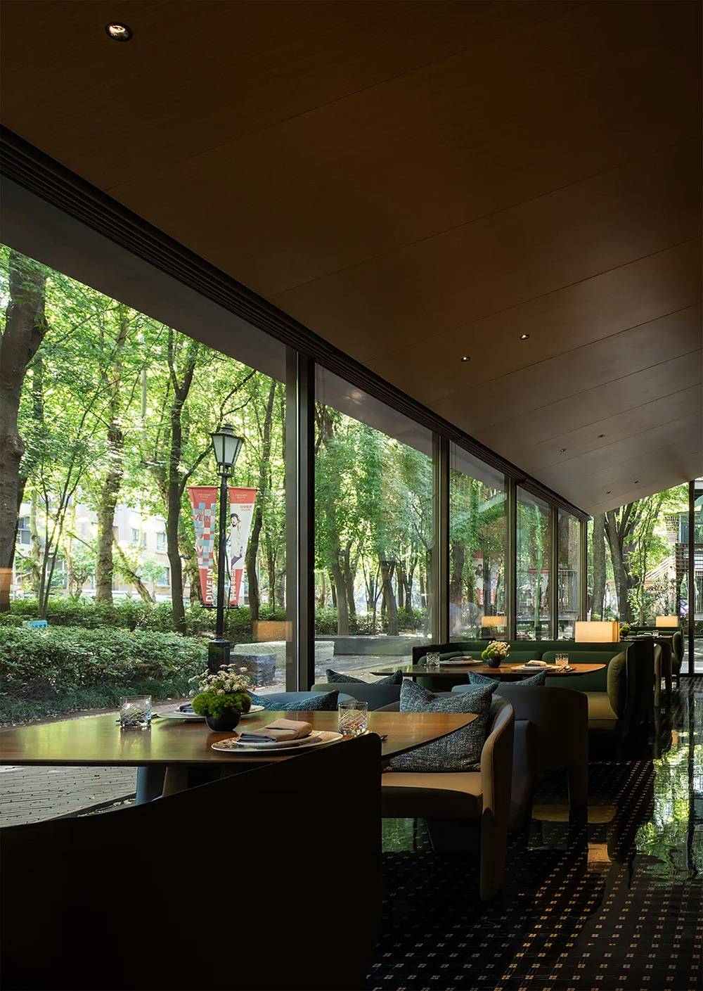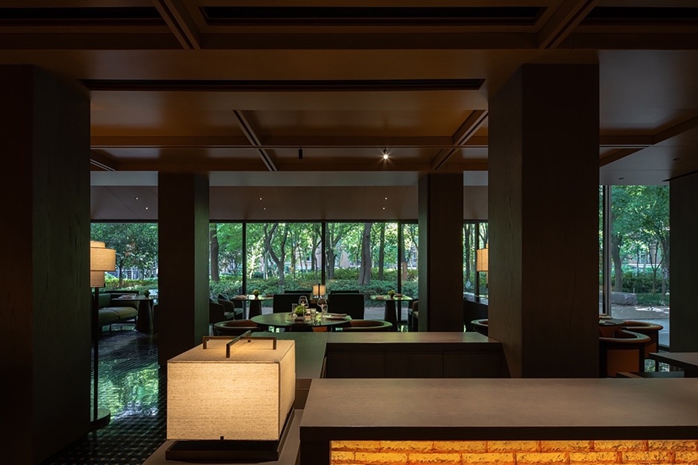三层的布局呈现环绕式,采取了中式园林当中的复廊形式,以长廊连接中心包间区域和露台,移步易景,共联江诗缱绻,画幅绵长。
