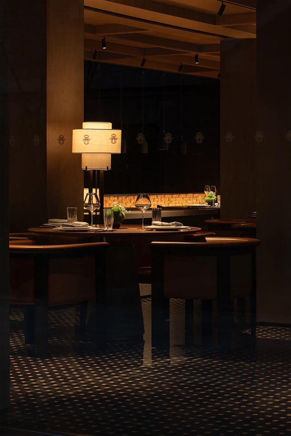 步入前厅,整齐排列的语言形式解读了设计中对于礼制形制的破除与重构:依照轴线排列的序列性→竖向圆柱体块的运用,在打破中构建新的秩序,追求空间形式中的和而不同。在灯具的选择上,也选取了多种类宫灯造型的品类,与空间中的古意和韵而唱。
