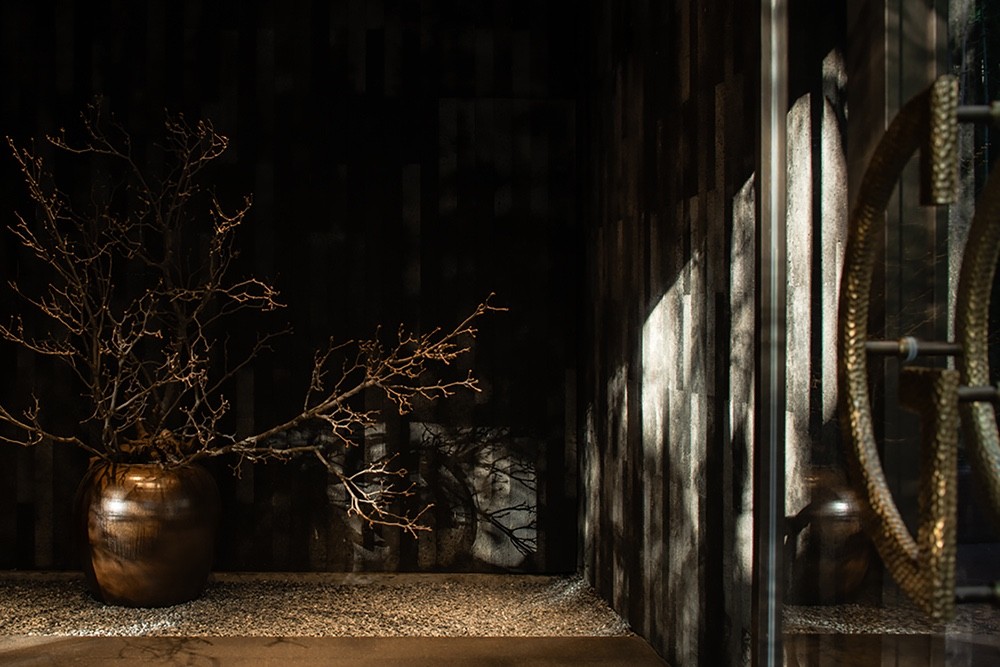 以质朴青绿作为主角基调,搭配朱红色的大面积布艺墙面,整体氛围营造出一种古朴雅致的东方意味。入口处青黑色大理石铺就的地面与朱砂红墙面形成强烈对比,引人入胜,两种反差极强的色彩大面积的展开,大胆而毫不掩饰的展示整个中华文化中雍容,大方的精神气韵。