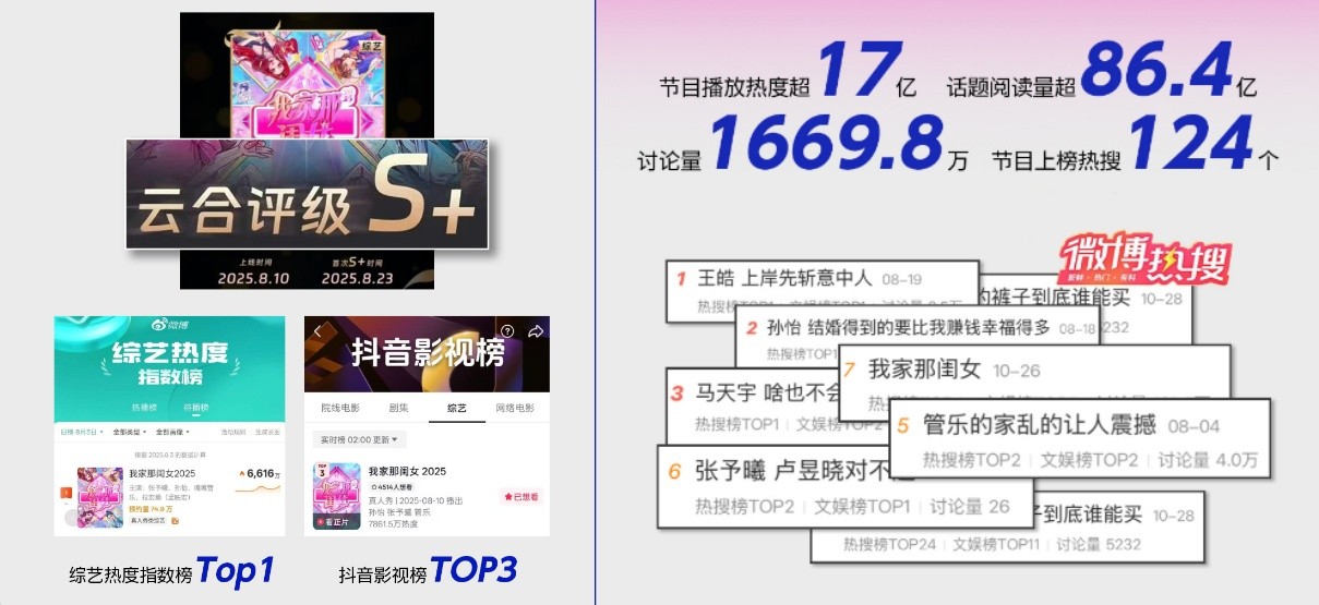 品牌实力与节目热度的双向赋能,实现了价值与流量的双重爆发。《我家那闺女2025》上线后口碑与热度双丰收,云合评级直冲S+,全网播放热度超17亿,话题阅读量突破86.4亿,讨论量达1669.8万,累计上榜热搜124个,为满婷提供了高精准、高价值的传播入口。