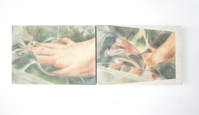 在这场几乎刻意回避数字影像的展览中,Silvia Muleo 的双频道录像《Skin Deep(prog26-04.05)》是唯一的例外——也因此成为整个展览逻辑最精密的一颗棋子。作品以一个人在不均匀反光表面自拍的动作开场:手、手机与面孔在光影的褶皱与数字操控中交替消隐,身份在自我凝视的过程中不断被侵蚀与重建。Muleo 援引实验录像的视觉语法,将自画像这一古老的艺术母题拉入当代的图像焦虑之中——令人想起 Bill Viola 的《倒影池》(The Reflecting Pool,1977–79),那个在水面涟漪中反复失真的人影。而在她的油画《轻声细语,让它进来》(2024)里,身体的图像再度趋于静止,但依然脆弱——一只手轻压柔软的织物,提醒着我们:活着的身体,从未真正停止运动。