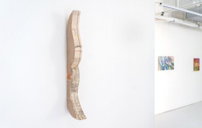 Sam King 以亚麻布为画布,在油彩中安放最日常的存在:一只瓶子,一把搁置的伞,一盏悬吊的灯。这些意象平凡至极,却因他处理颜料的方式而获得了某种超出自身的重量——笔触在物体的轮廓处游移,光影在透明与不透明之间协商,仿佛日常之物在被凝视的瞬间,开始缓慢地向观者倾斜,透露出某种秘密。在展览中,他与 Bo Kim 的作品形成一组微妙的共振:同样关注物质的可见性,却从截然不同的叙事起点出发。