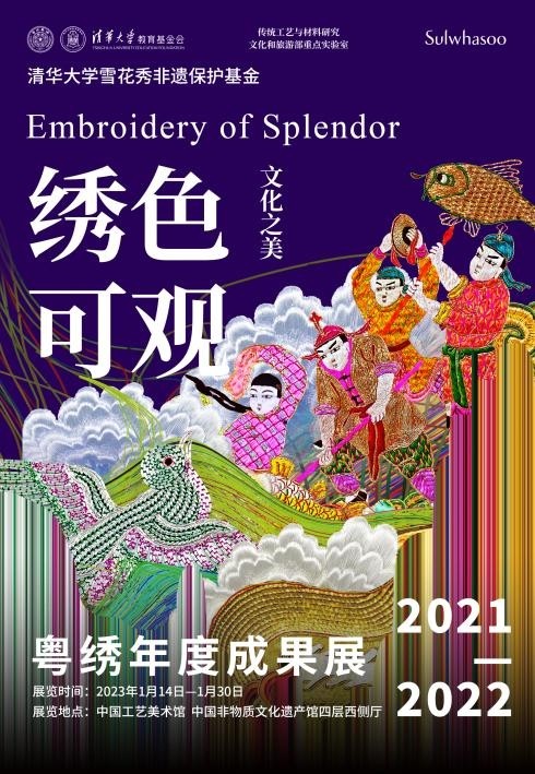 2023年1月14日—2023年1月30日,清华大学雪花秀非遗保护基金粤绣年度成果展——“文化之美·绣色可观”将在中国非遗殿堂——中国工艺美术馆(中国非物质文化遗产馆)与公众见面,发布2021-2022年度对粤绣技艺深入探索的成果。
