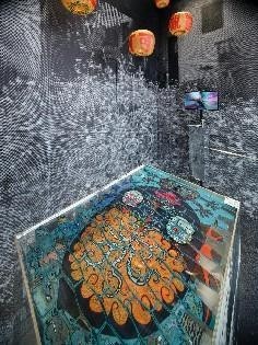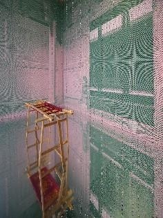 设计师利用像素化处理的古建筑图片、镜面、珠帘,塑造了阿婆祠和空院落的空间意象,搭建了与方伯第格局一致的主展区,并利用镜面将其无限延伸,在放大空间的同时,提升观众观展趣味。另外,展览团队也使用彩色麻绳、线卷轴等物料丰富空间。