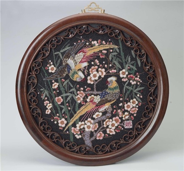 黄伟雄珠绣作品《梅姿竹影戏锦鸡》