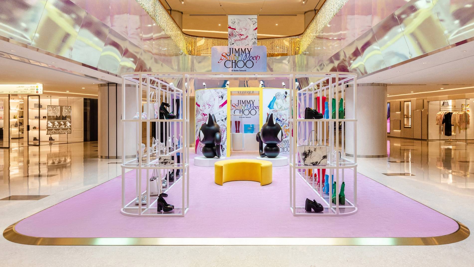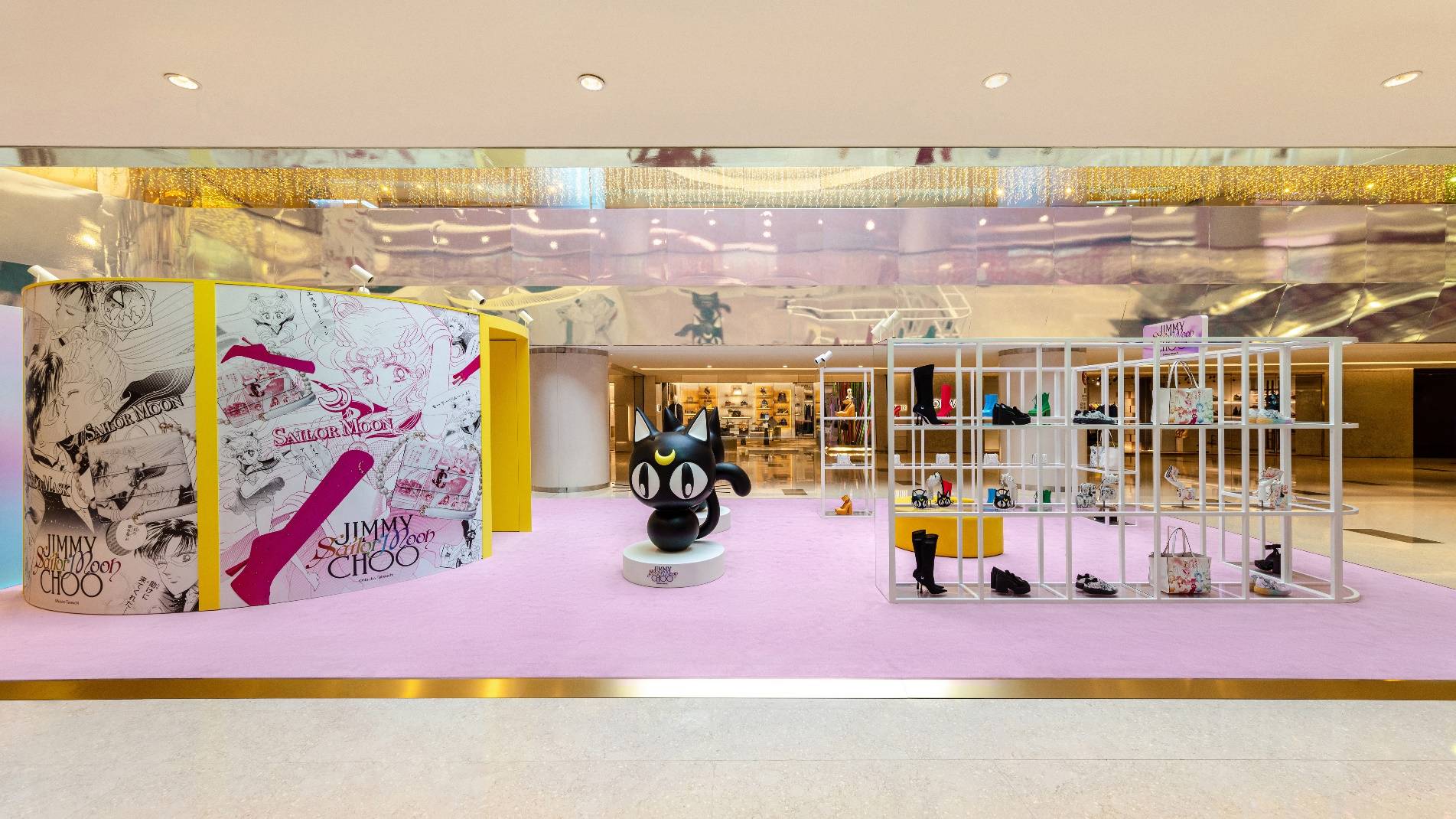 令人惊叹的幻彩装置灵感来自于美少女战士耀眼的变身过程,以及为搭配限量合作系列的单品,而特别定制的新月形脚凳,真人大小的露娜猫以及漫画幻彩布景。