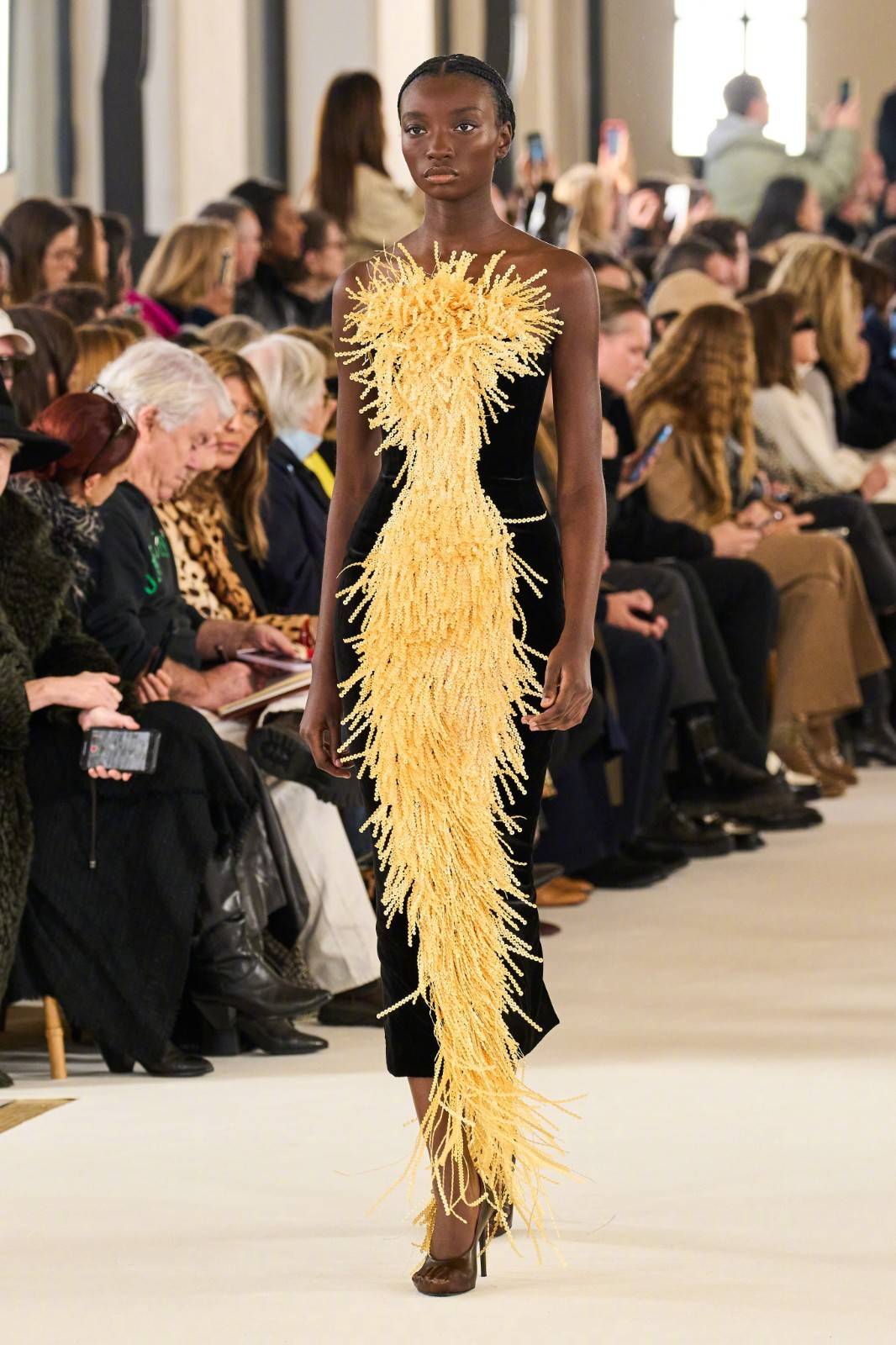 杨紫琼穿上了这两年diva大爱的Schiaparelli,刚刚从秀场上抱下来的黑色礼服前装饰上了金穗穗,非常突破想象界限的设计。