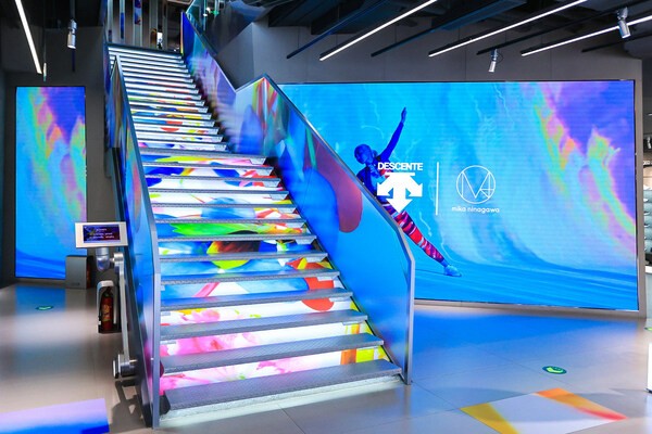 在这里,极具代表性的花卉元素随处可见。跟随空间动线,楼梯地面及两侧众多花卉互相呼应。来到二层运动空间,DESCENTE x蜷川实花联名LOGO背景墙首先映入眼帘,灵感花卉点缀充盈整个运动空间,辗转至光影打卡区,投影在墙面的艺术家光影作品延伸至地面,如瀑布倾泻,浪漫生动。