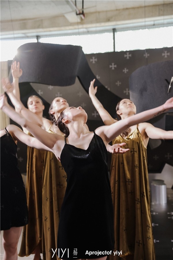 发布会现场布置由黑、暗金、米色组合而成,鲜明暗金丝绒元素,用色彩与质感为冰冷的建筑空间赋予全新的内涵。发布会当天由美国编舞、表演艺术家Annelises Charek带领其现代舞团SLATE开幕演绎,为观者们呈现出了一场具有特色的时装舞蹈盛宴。表演者身穿APJOY秋冬真丝丝绒吊带裙,Y字作为品牌全新的风格符号化作印花,飘逸灵动。现场有数百位KOL到场参观打卡,一同探索YIYI易一2023秋冬系列IDEAL PLACE的世界。
