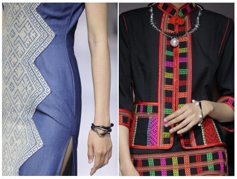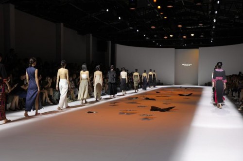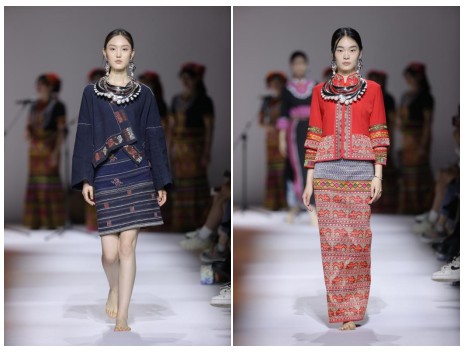 大秀开场,模特身着丰富图纹和鲜明热烈色彩的传统黎族服饰,佩戴风格瞩目的蝴蝶黎锦系列,宛如一场与黎族手工艺先辈们穿越时空的对话,令人动容。