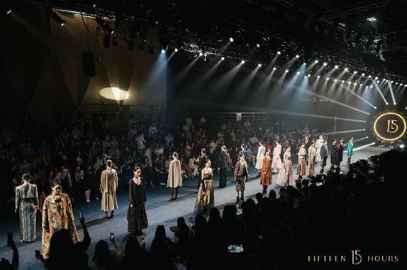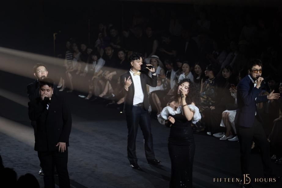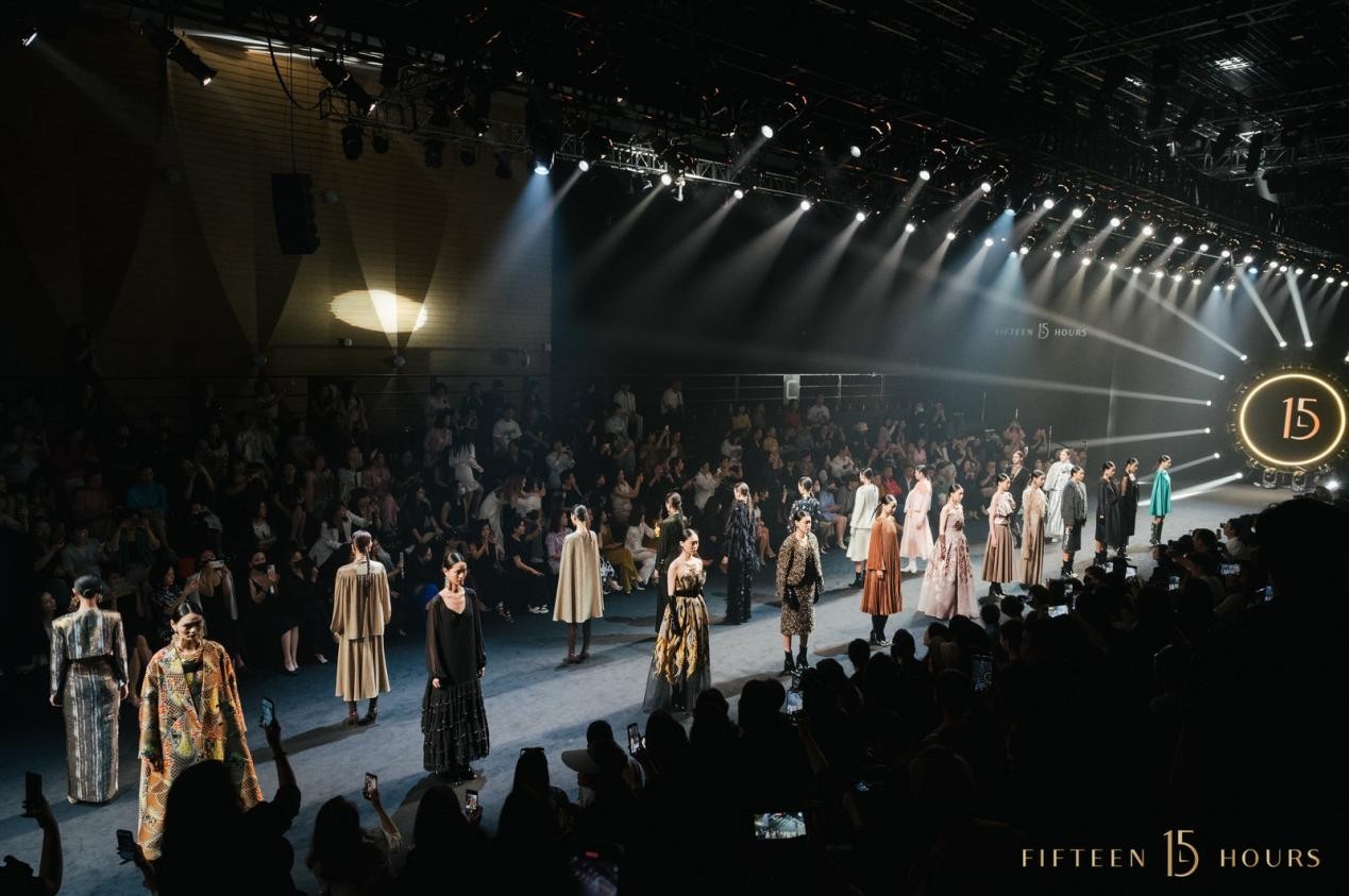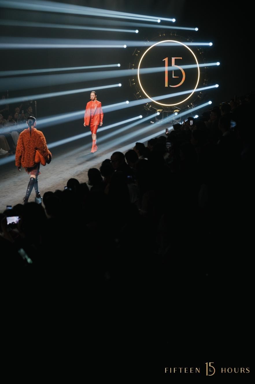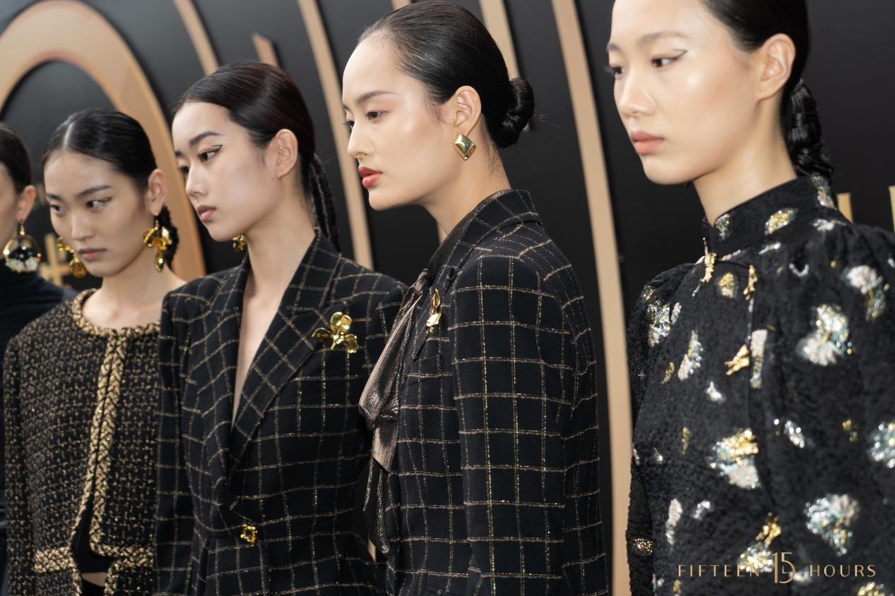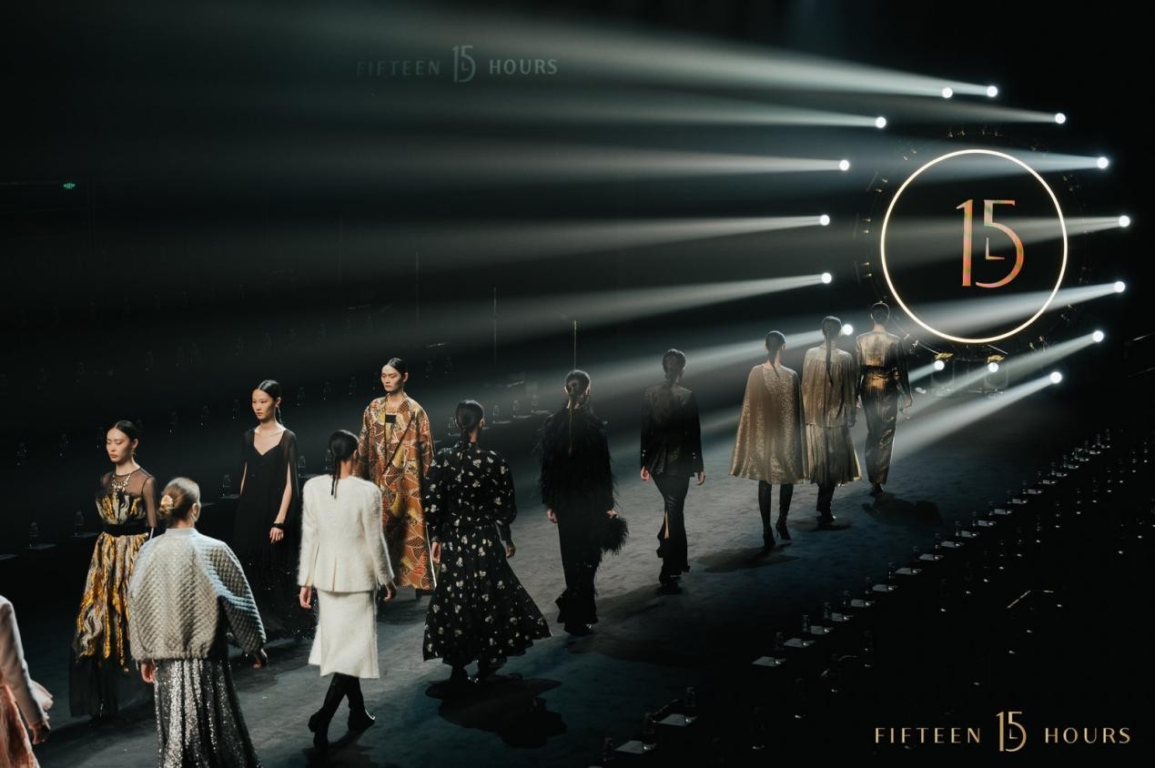 大秀开启,特制的15小时时钟打开时空之门,光斑点亮T台,在乐团的阿卡贝拉演唱中,模特穿越时空隧道踏步而来,让到场嘉宾沉浸式进入15小时的鎏金之境。