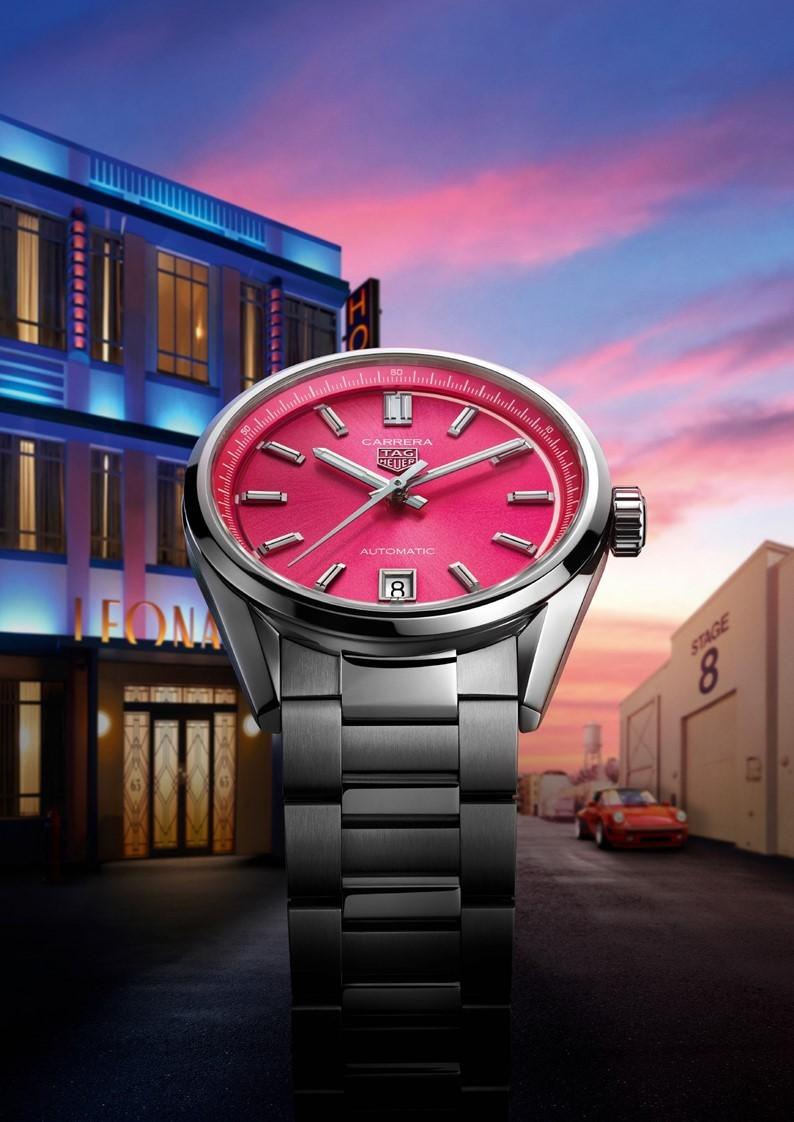 电影中高斯林不顾一切想要留下的新一代卡莱拉腕表是一枚全新的泰格豪雅卡莱拉系列计时码表,它采用了被称为“glassbox” (玻璃盒)的穹顶状蓝宝石表镜,表镜与环绕表盘边界的测速刻度严丝合缝,与表壳融为一体。腕表配备了极富魅力的标志性蓝色表盘,配以蓝色小牛皮表带。这是一款看起来从未如此现代的标志性之作,难怪高斯林不愿意轻易放弃它,也是一款真正值得你全力以赴的时计。同时,拜尔所饰演的道具师佩戴的则是粉色的全新泰格豪雅卡莱拉系列36毫米腕表。