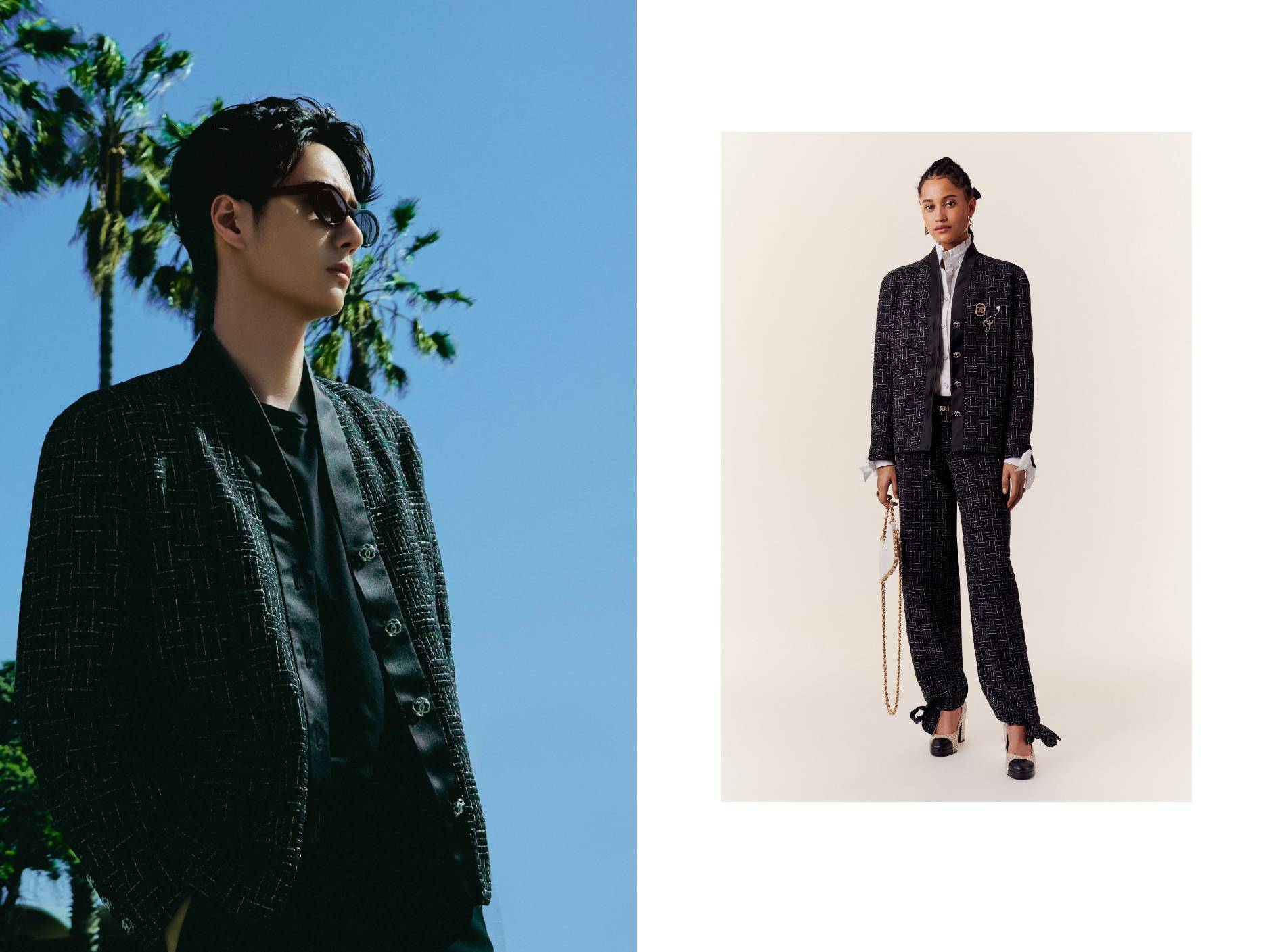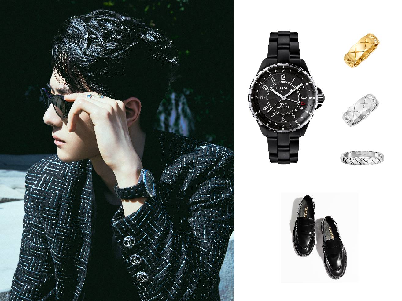 香奈儿品牌形象大使王一博身着CHANEL 2023秋冬预告系列斜纹软呢外套,搭配莫卡辛鞋与太阳眼镜,佩戴J12 GMT腕表与高级珠宝COCO CRUSH系列戒指,出席CHANEL 2023/24早春度假系列发布会。