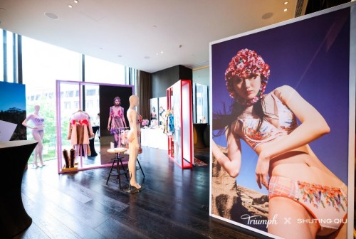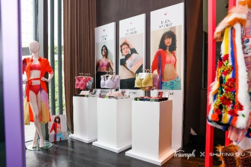 活动现场设置了产品展示区,尽显品牌大胆张扬的设计美学。展区汲取联名系列鲜明的色彩碰撞,玩转品牌标志性元素,吸引来宾们纷纷打卡留影。交错叠布的陈列方式,营造出一种沉浸式的感官体验,令来宾置身于极繁主义的时尚世界。在展区内通过 SHUTING QIU AW23时装周秀场同款与联名系列的创意陈列,来宾可以了解到Triumph × SHUTING QIU联名系列及品牌经典系列精致的做工和产品细节,感受Triumph黛安芬独具一格的产品魅力,更能近距离体验Flex Smart小核芯系列、360 Curve系列、无钢圈系列等Triumph黛安芬品牌焕新后的人气产品。