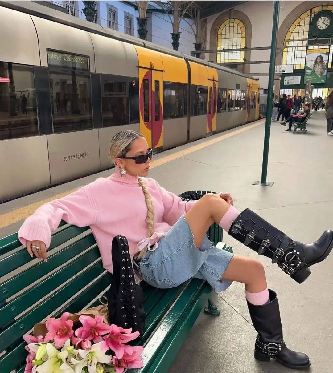 如果担心靴子会把小腿拉短,可以套一个同色中筒袜,瘦腿效果立竿见影。这和韩国女团喜欢将中筒袜搭配凉鞋是一个道理。